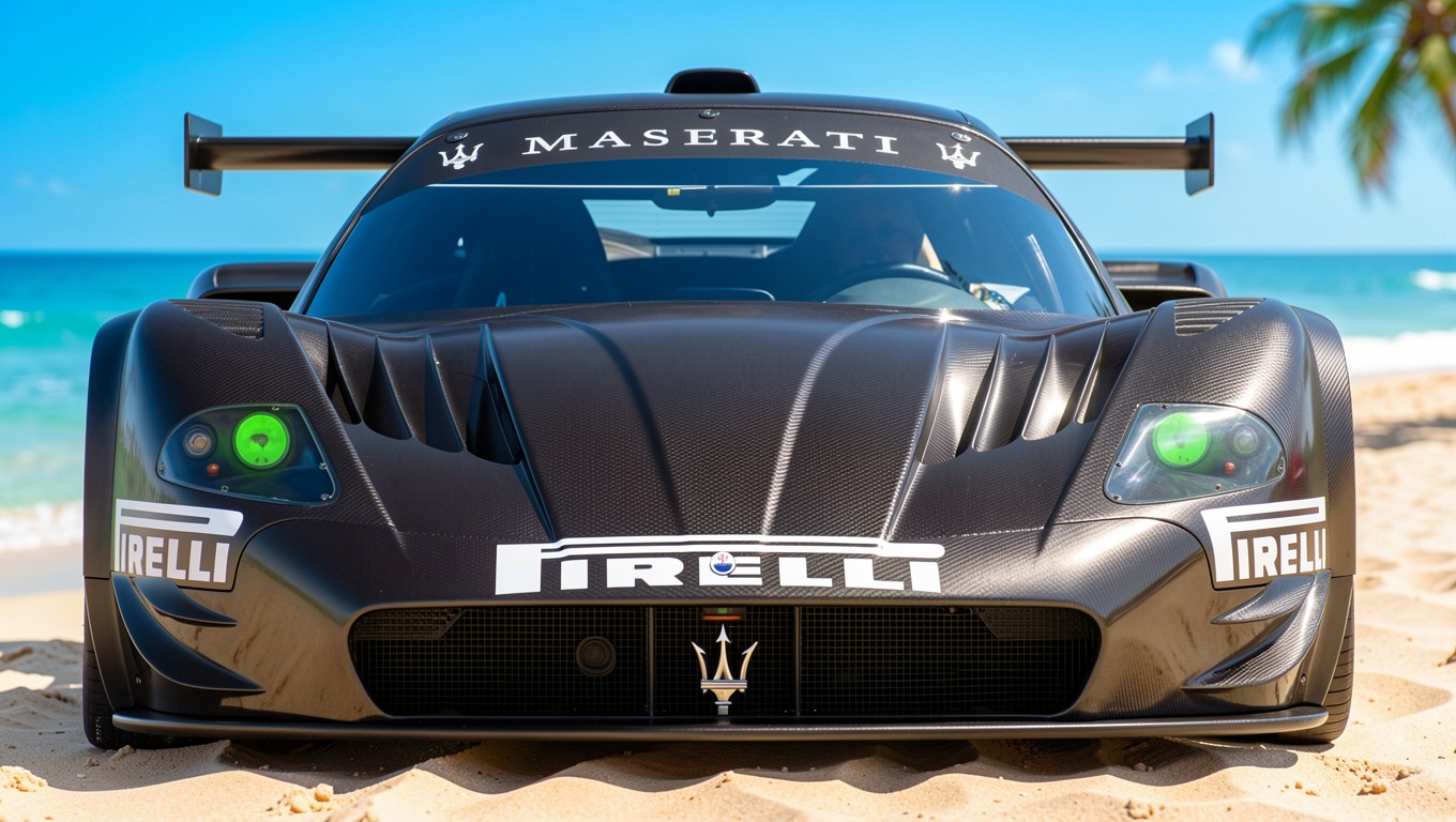 Черный гоночный автомобиль Maserati на песчаном пляже