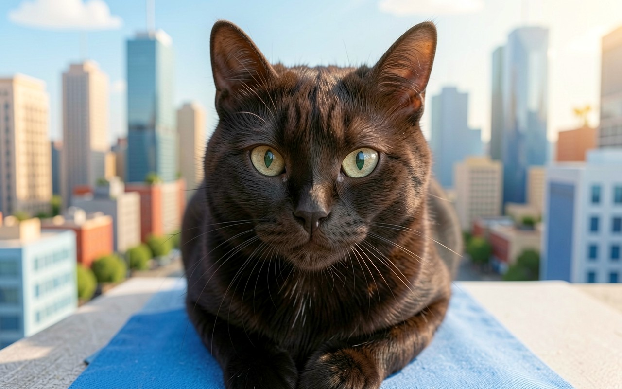Черный кот на синем коврике в городе
