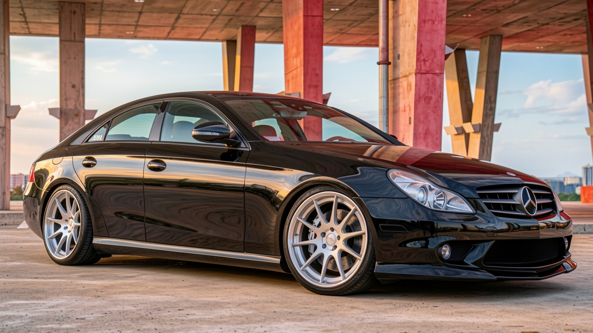 Черный Mercedes CLS в индустриальном бетонном ангаре