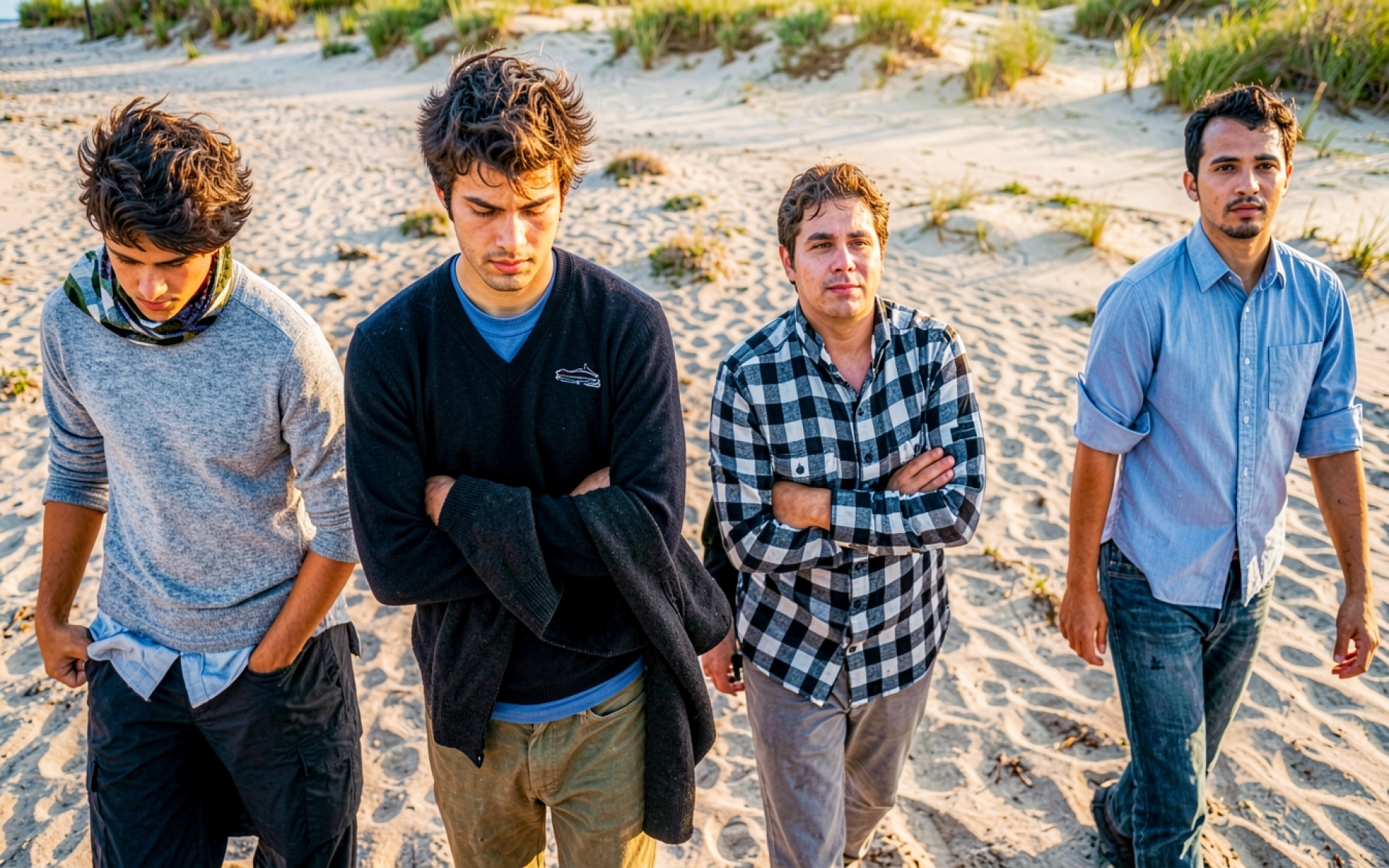 Четверо мужчин на песчаном пляже при закате