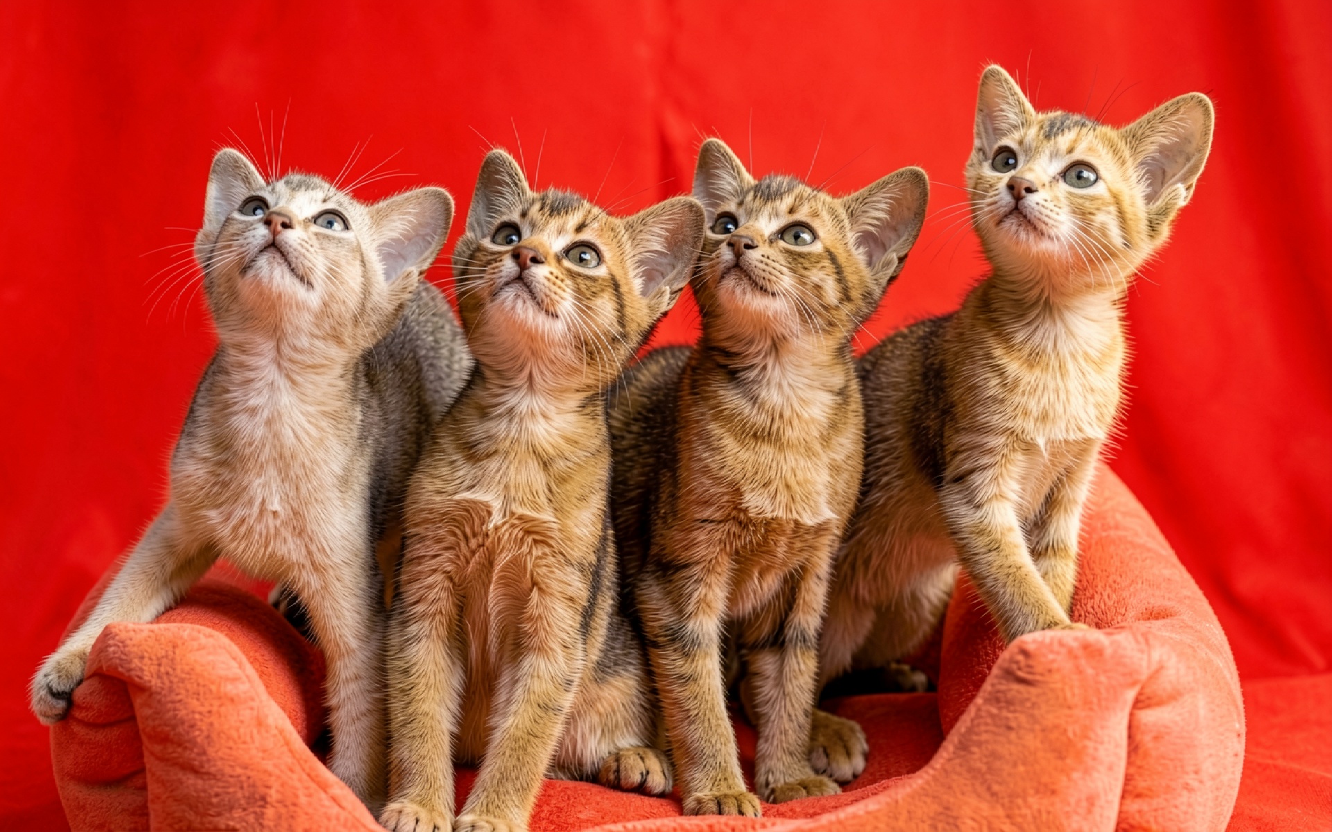 Четыре рыжих котенка в красной мягкой корзине