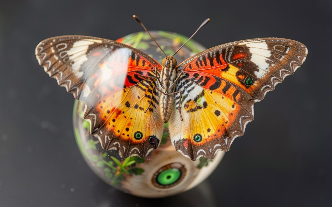 Оранжевая бабочка на стеклянном шаре темный фон