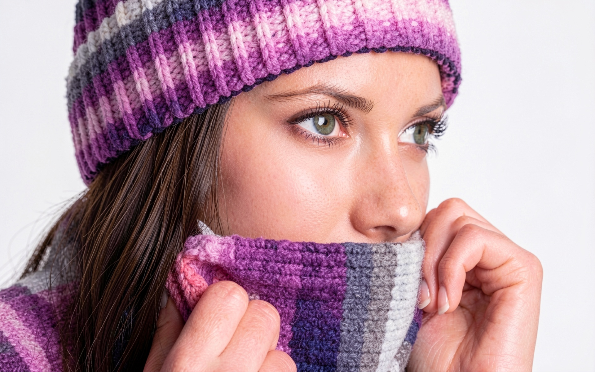 Девушка в фиолетовой вязаной шапке и шарфе