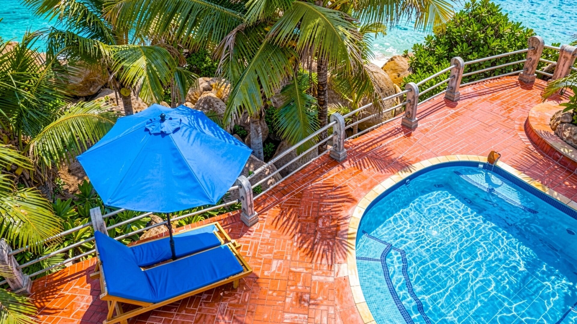 Тропический бассейн с синим зонтом и шезлонгом