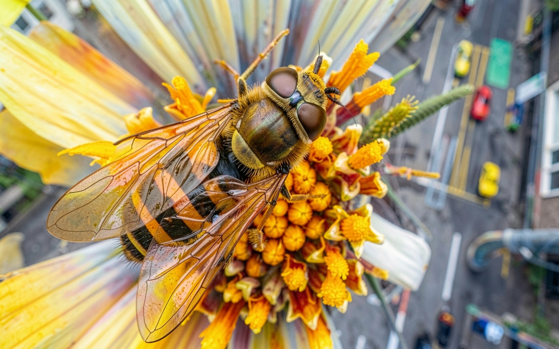 Шмель на желтом цветке в городском окружении