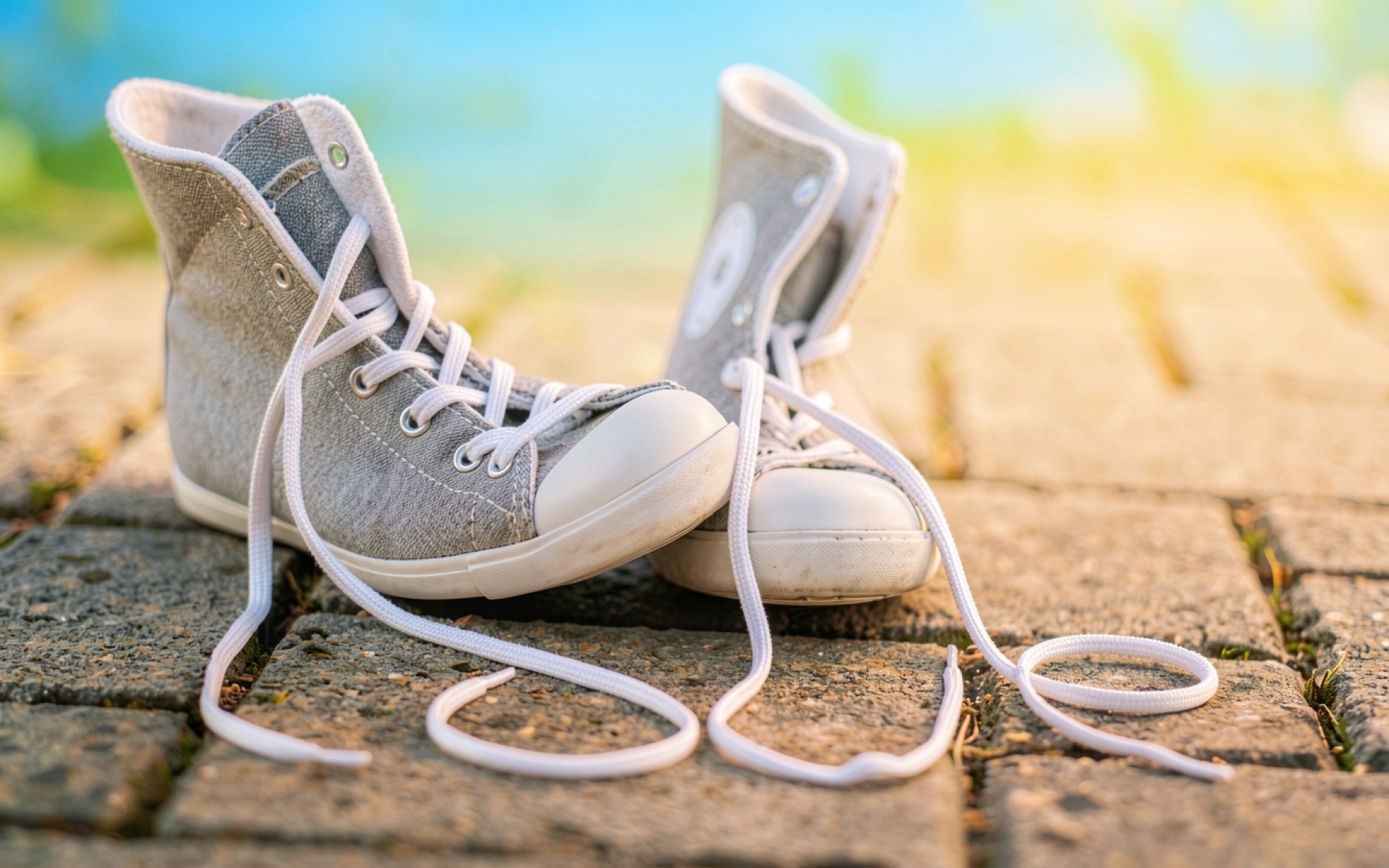 Серые кеды с белыми шнурками на мостовой