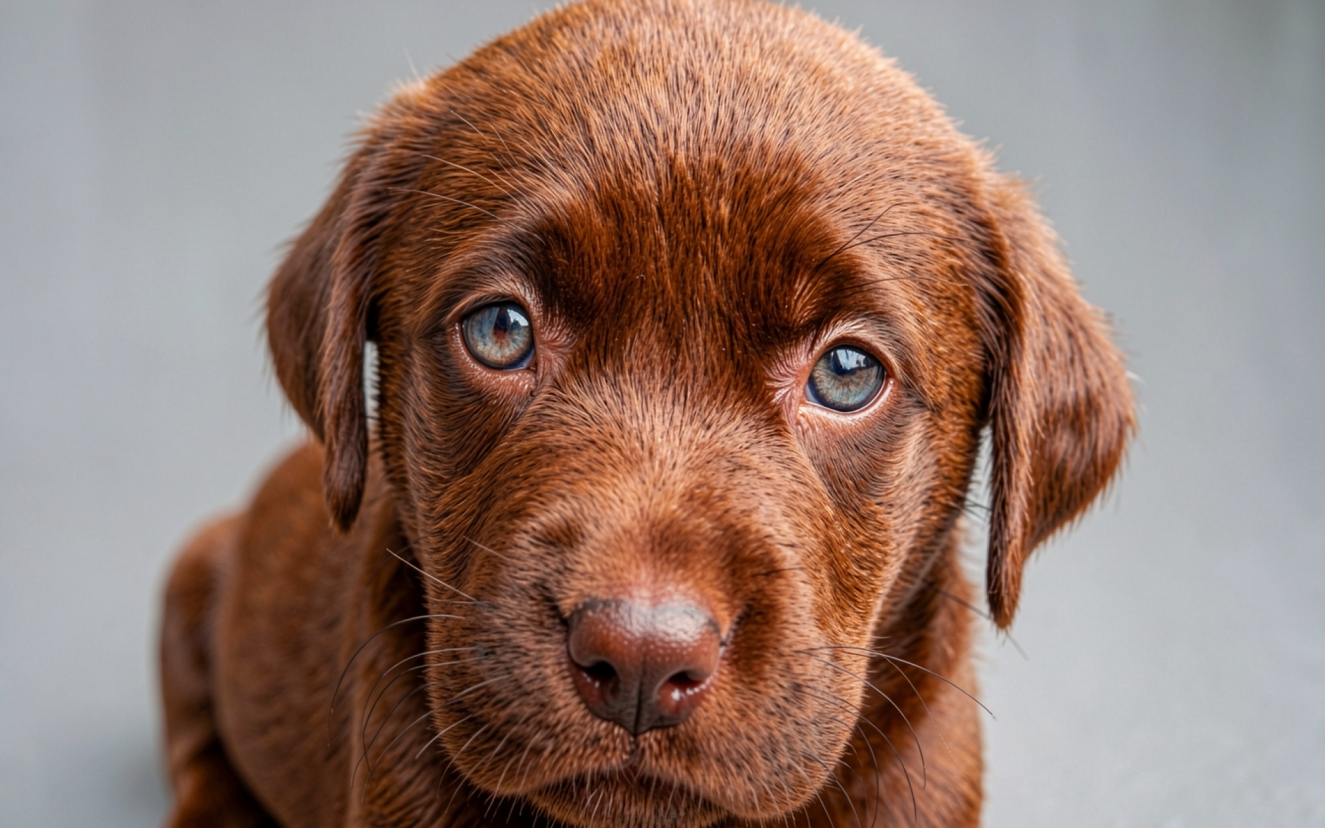 Щенок лабрадора коричневого цвета на сером фоне
