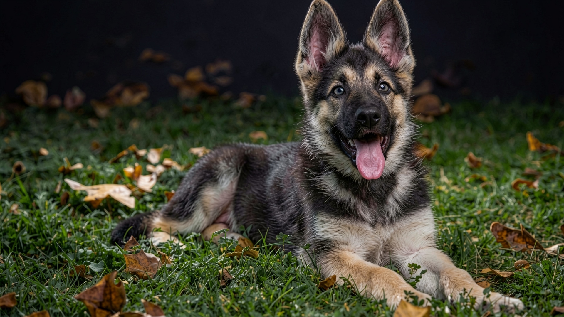 Щенок немецкой овчарки на зеленой траве осенью