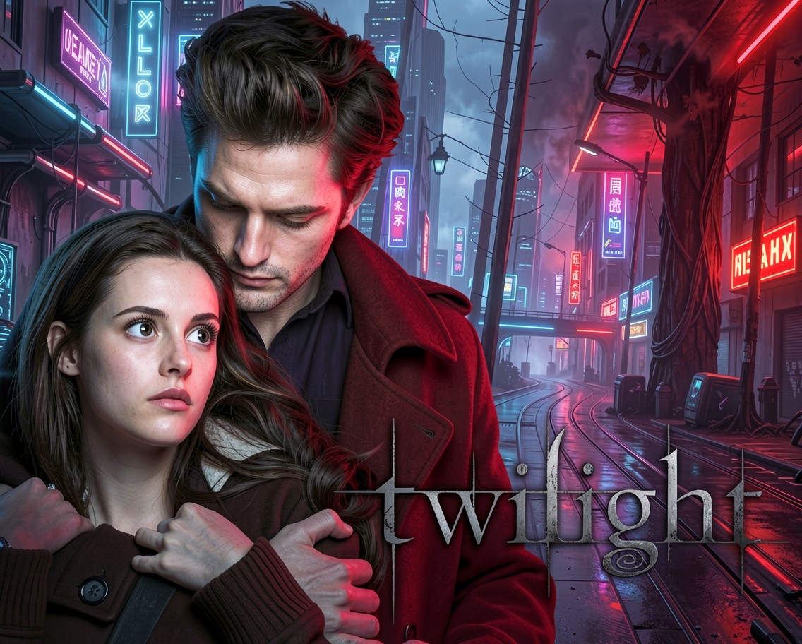 Эдвард и Белла в неоновом городе киберпанк