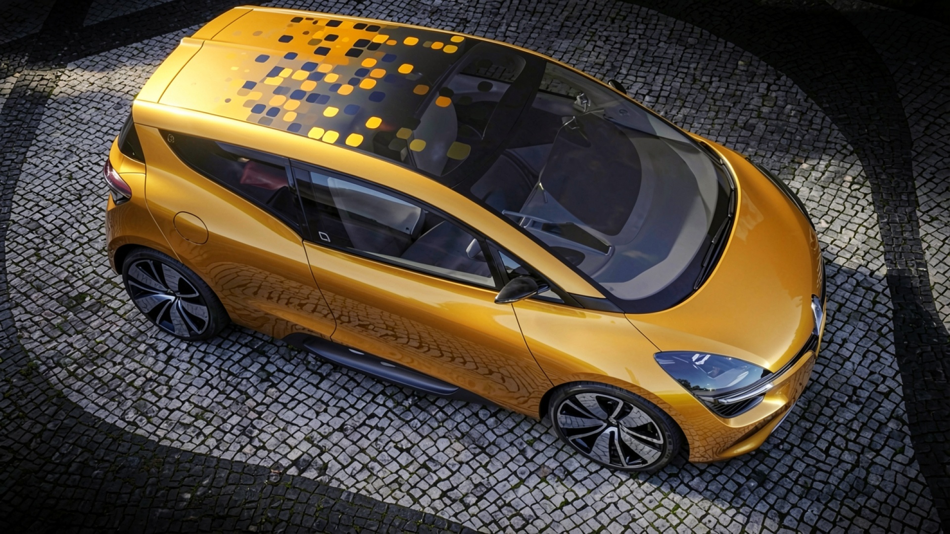 Желтый электромобиль на серой брусчатке сверху
