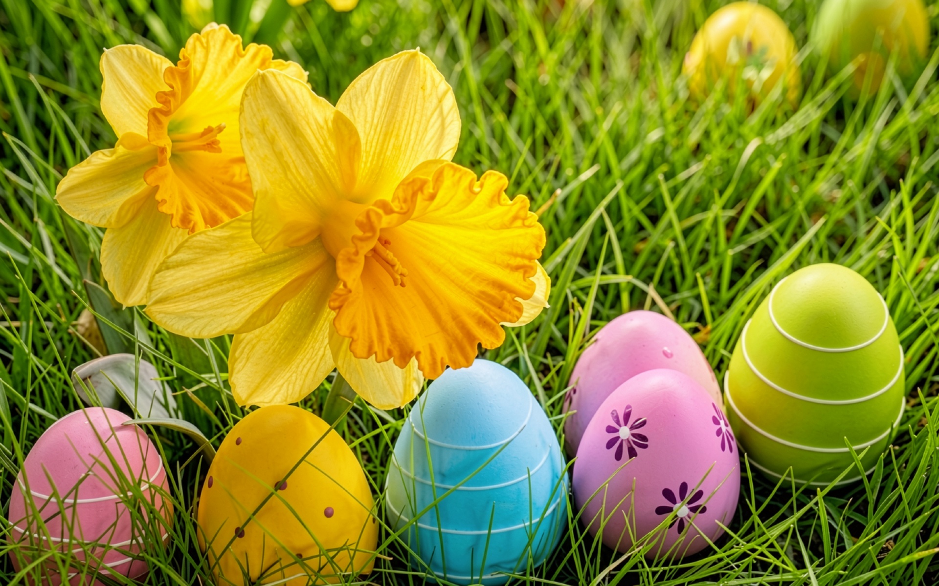 Желтые нарциссы и разноцветные пасхальные яйца в траве