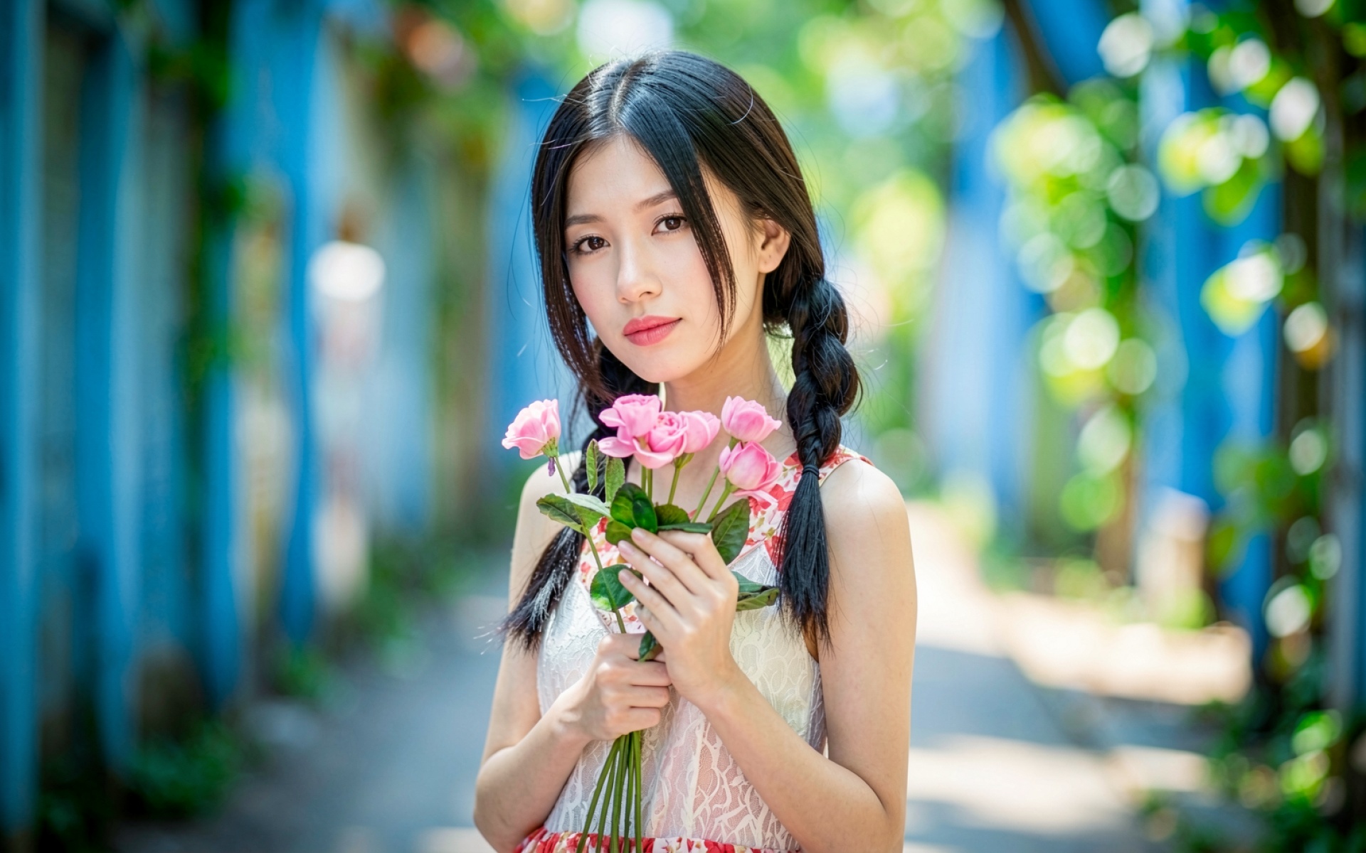 Японка с розовыми розами голубой фон