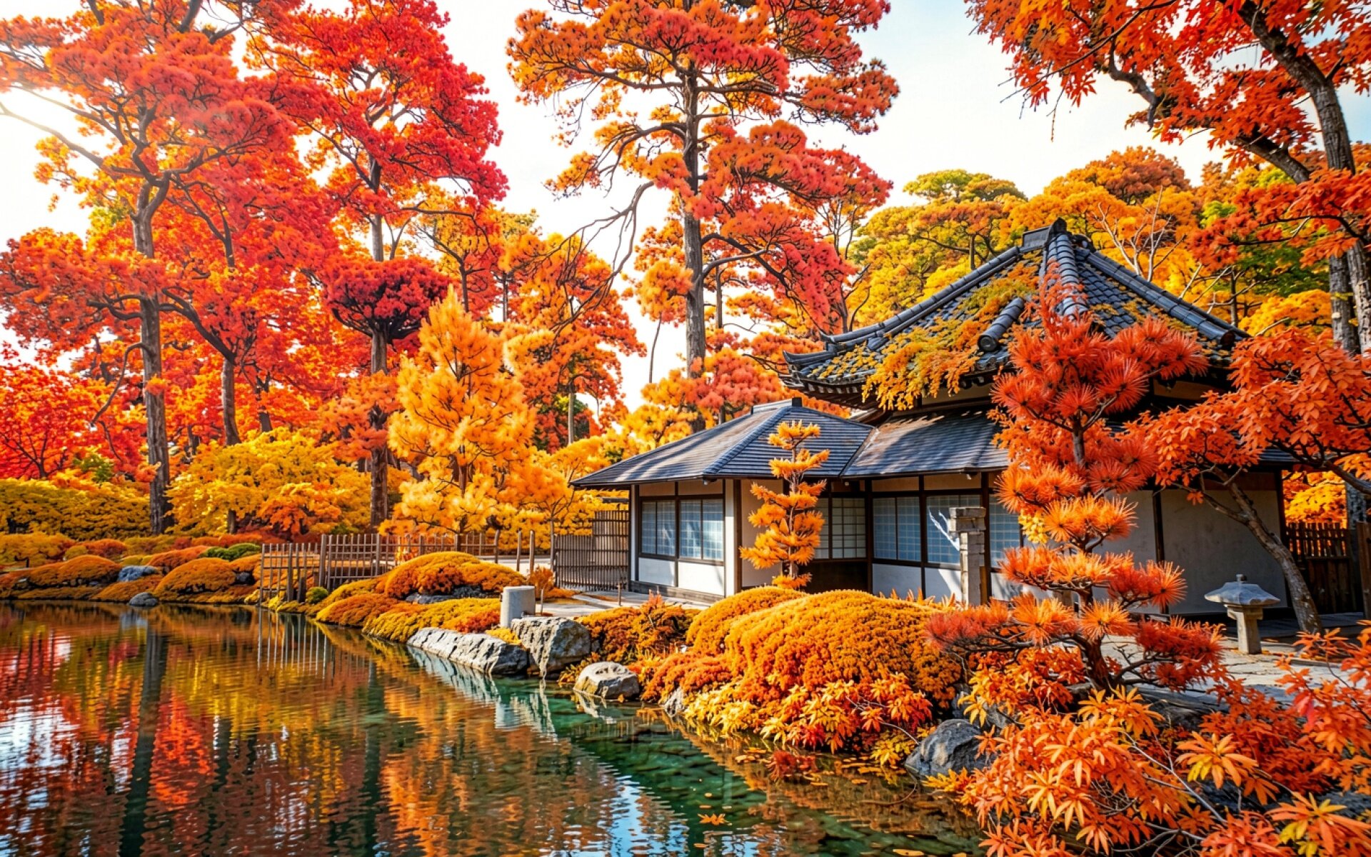 Японский дом в осеннем саду с прудом