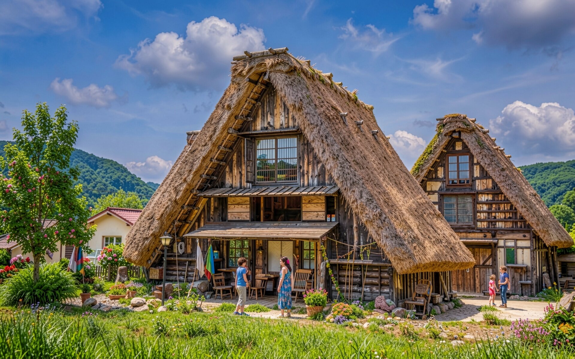 Японский дом гассё-дзукури в летнем горном пейзаже