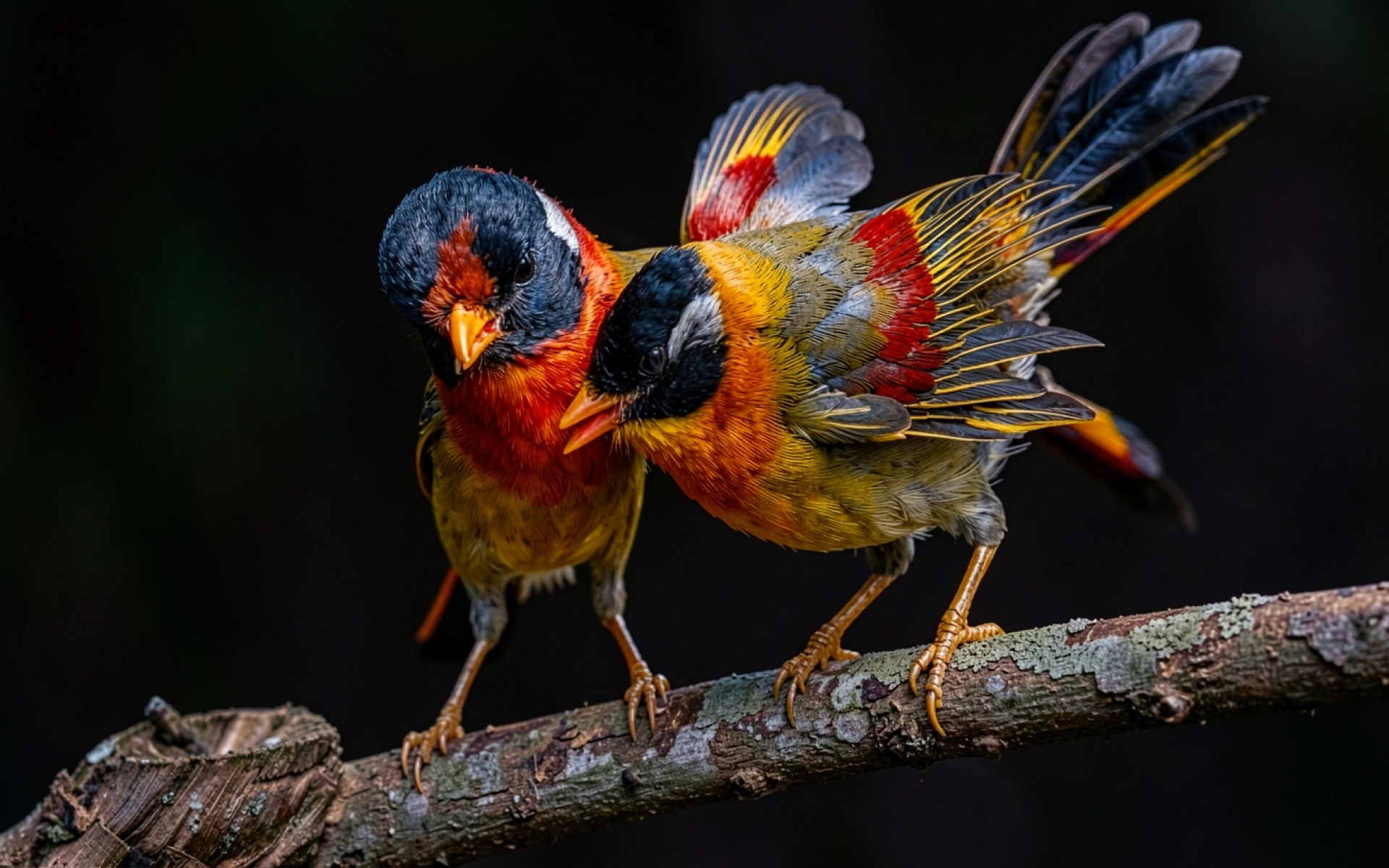 Две яркие птицы на темном фоне