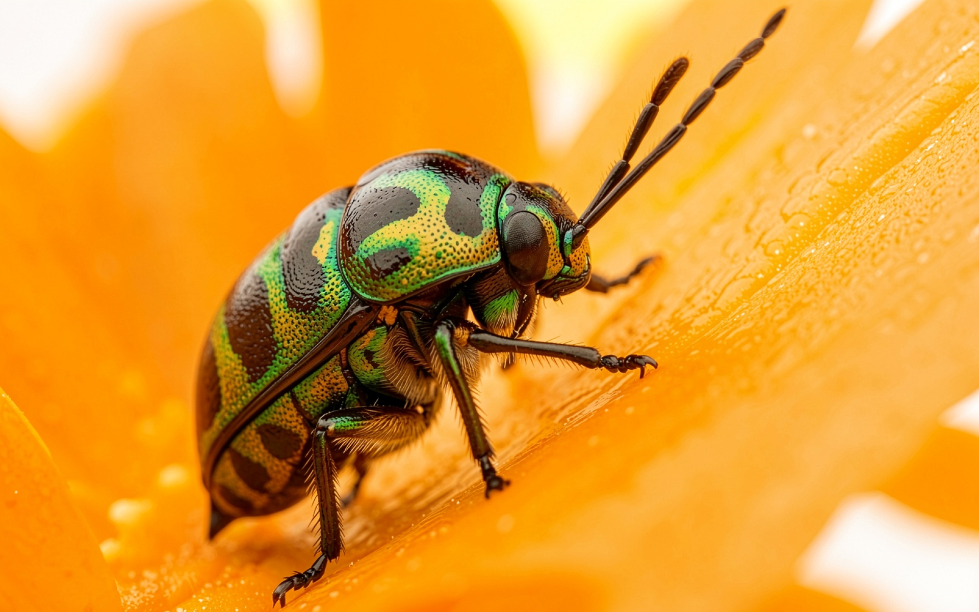 Зеленый жук макросъемка яркий оранжевый фон