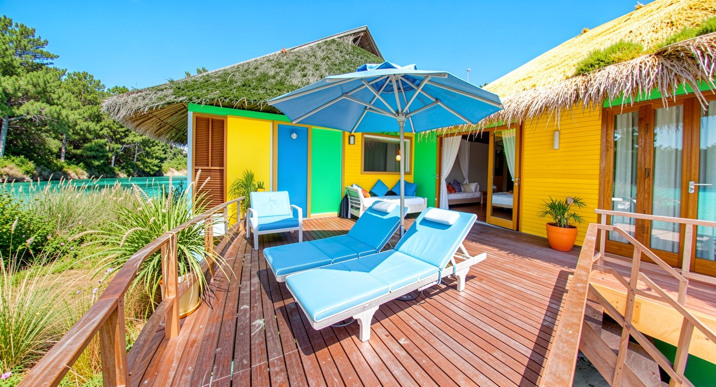 Яркий тропический дом с голубыми шезлонгами