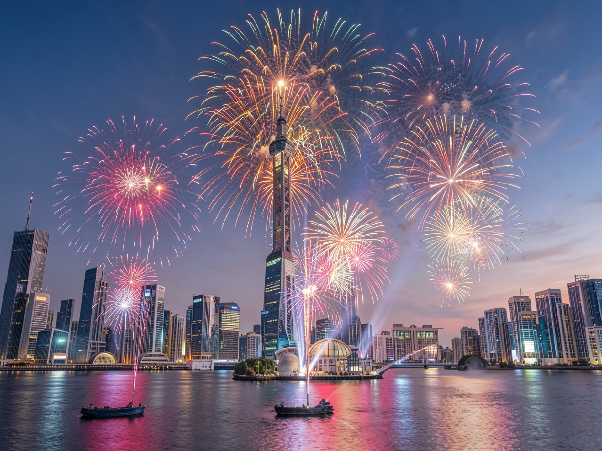 Ночной город Дубай с ярким фейерверком