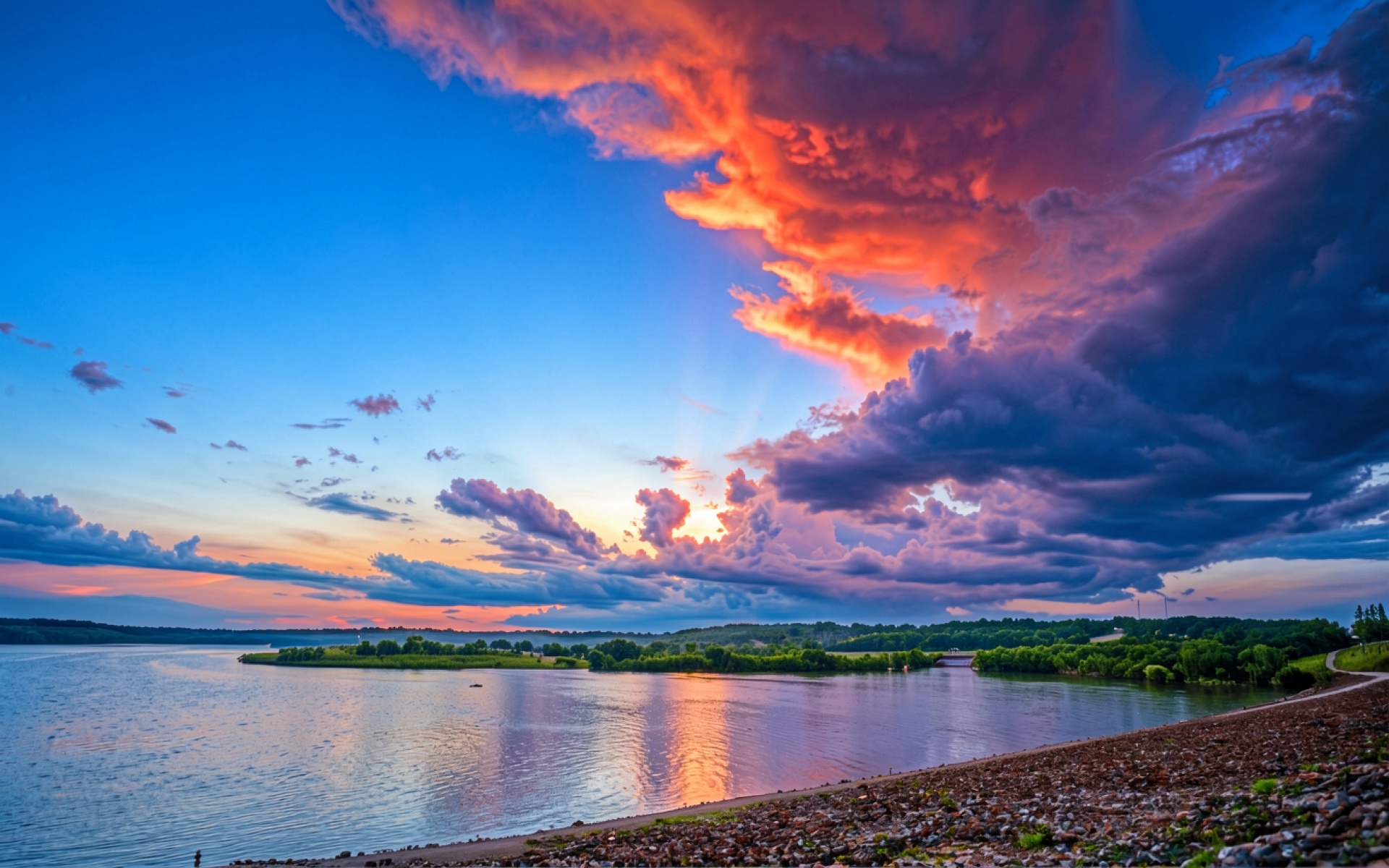 Закат над рекой с яркими облаками