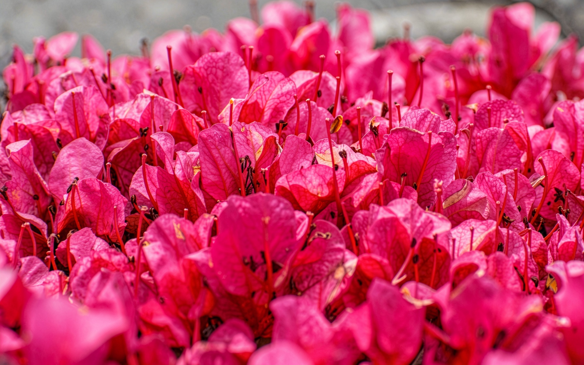 Ярко-розовые цветы бугенвиллеи на сером фоне