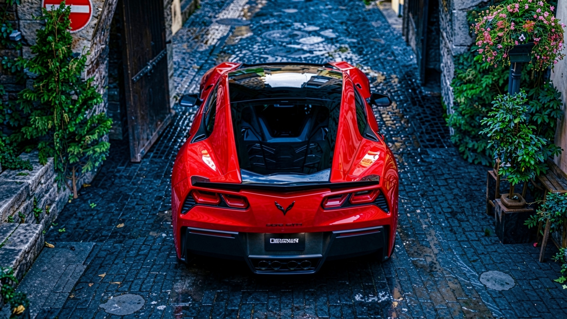 Красный спорткар Chevrolet Corvette на мощеной улице