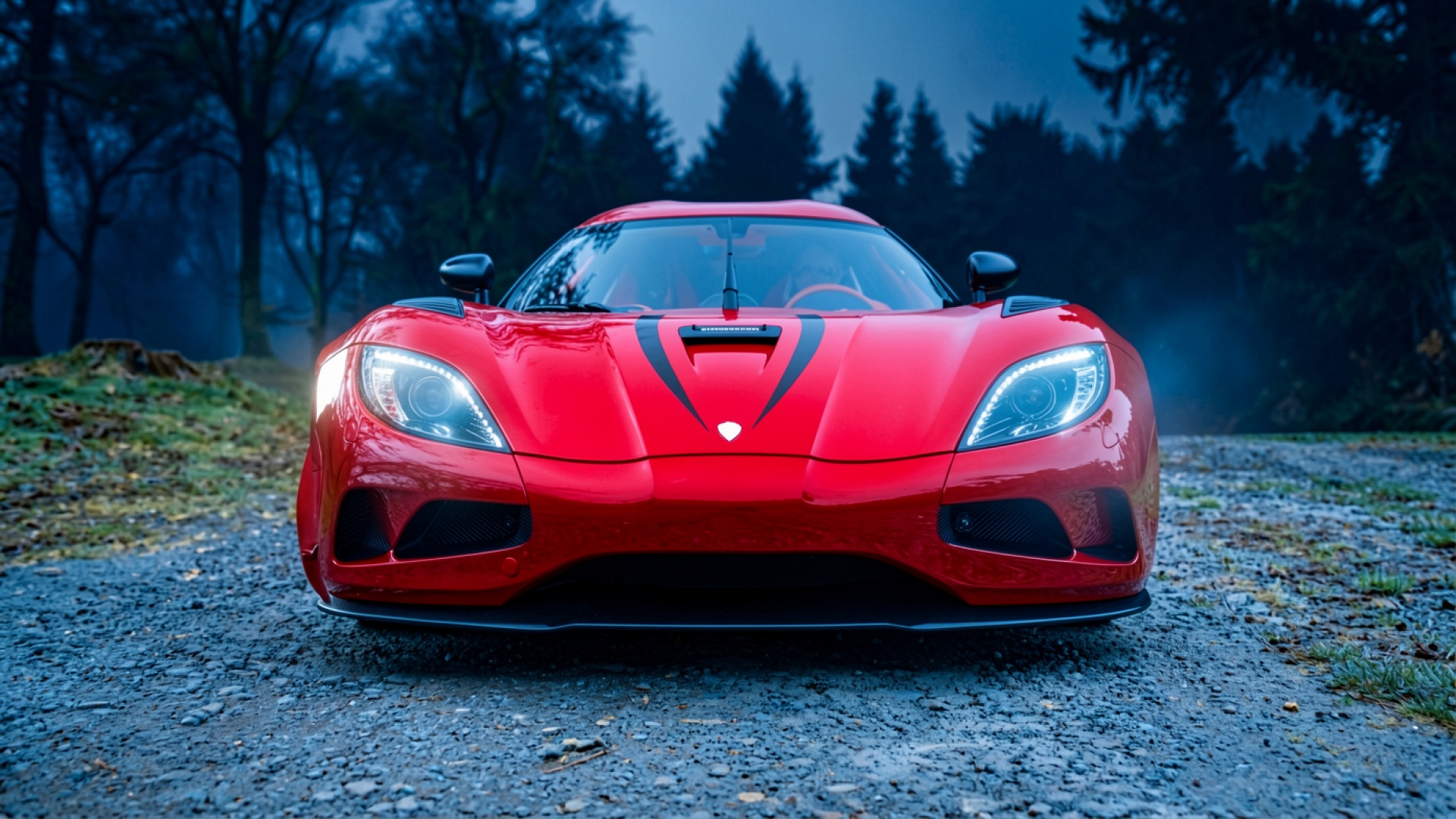 Красный суперкар Koenigsegg в туманном лесу