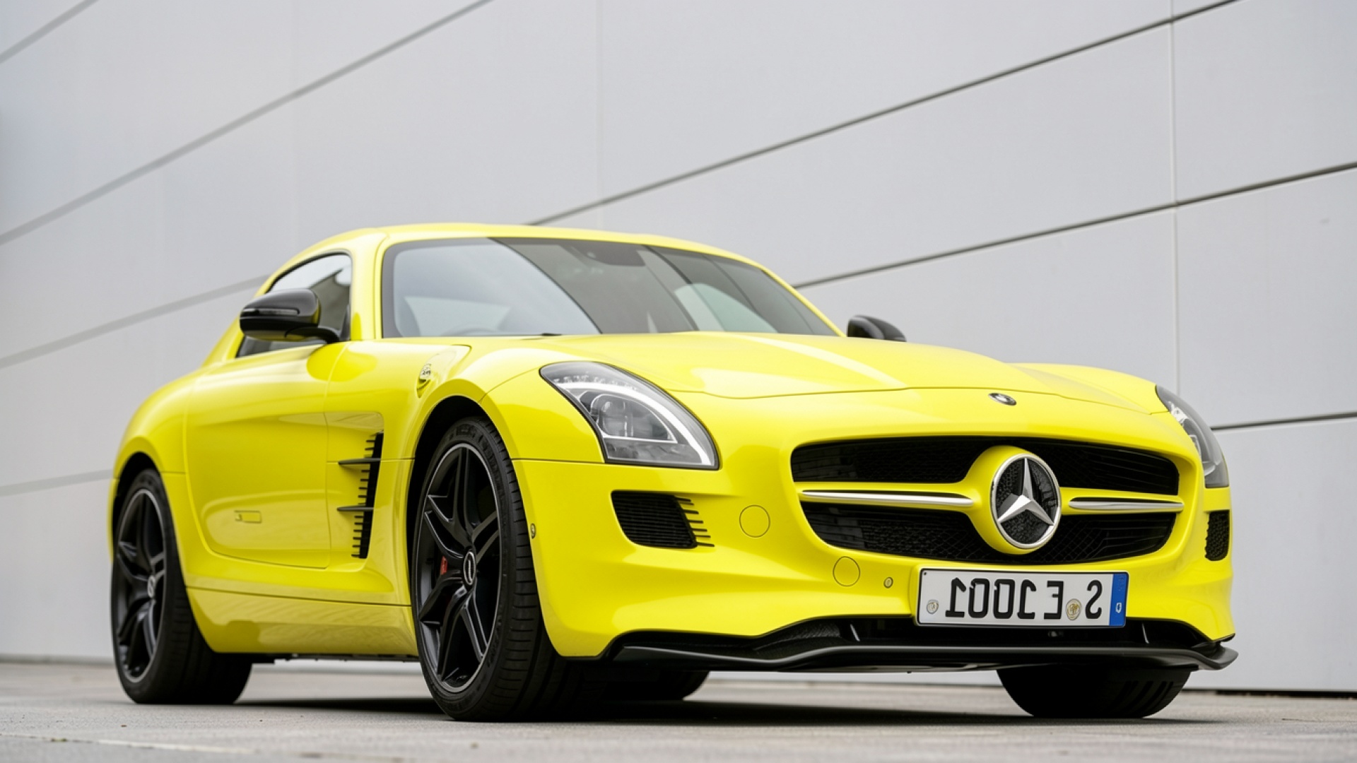 Желтый Mercedes SLS AMG на сером фоне