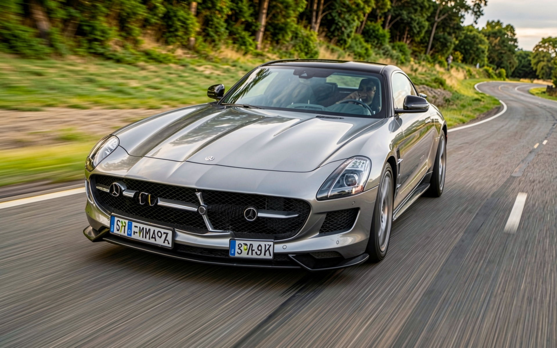 Серый спортивный автомобиль Mercedes-AMG GT на дороге