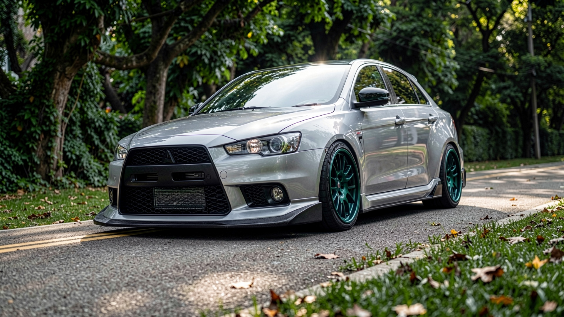 Mitsubishi Lancer Evolution серебристый бирюзовые диски лес