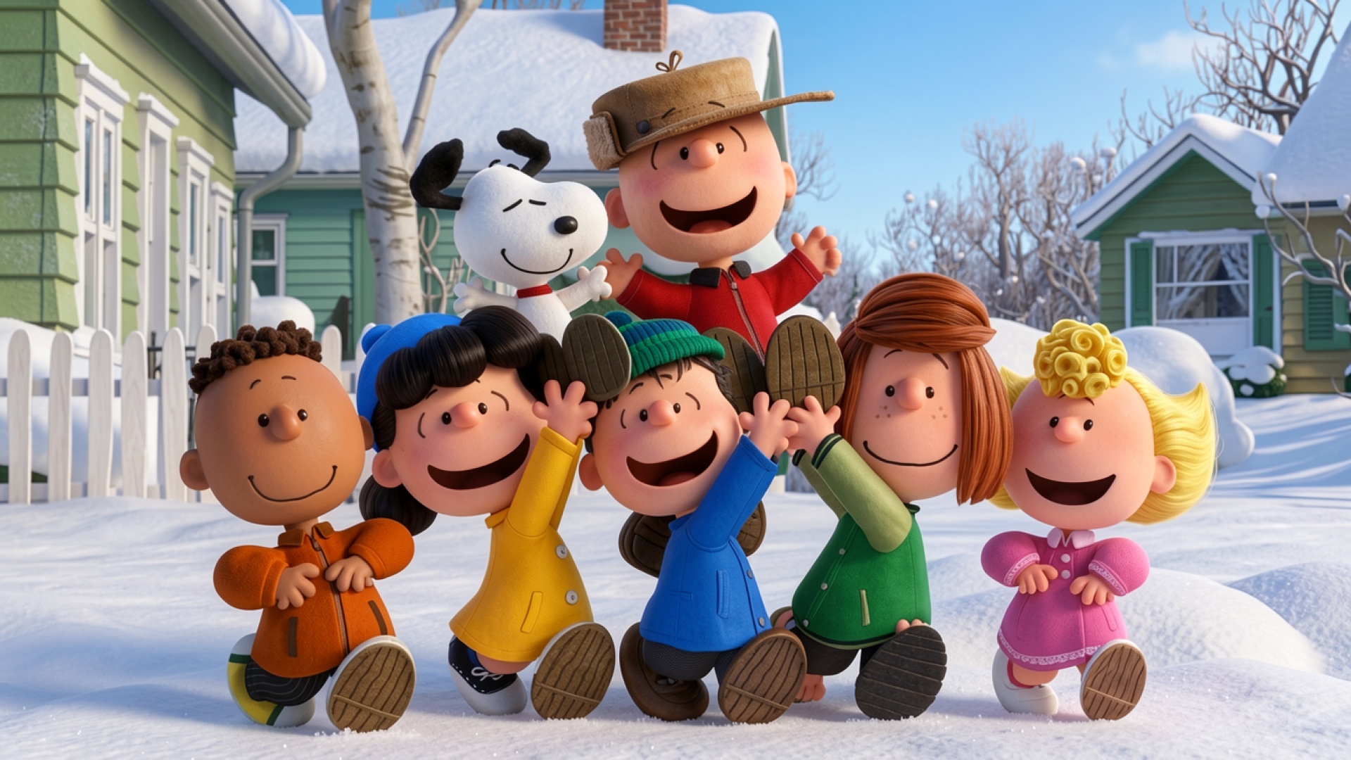 Персонажи комикса Peanuts в зимнем заснеженном городке
