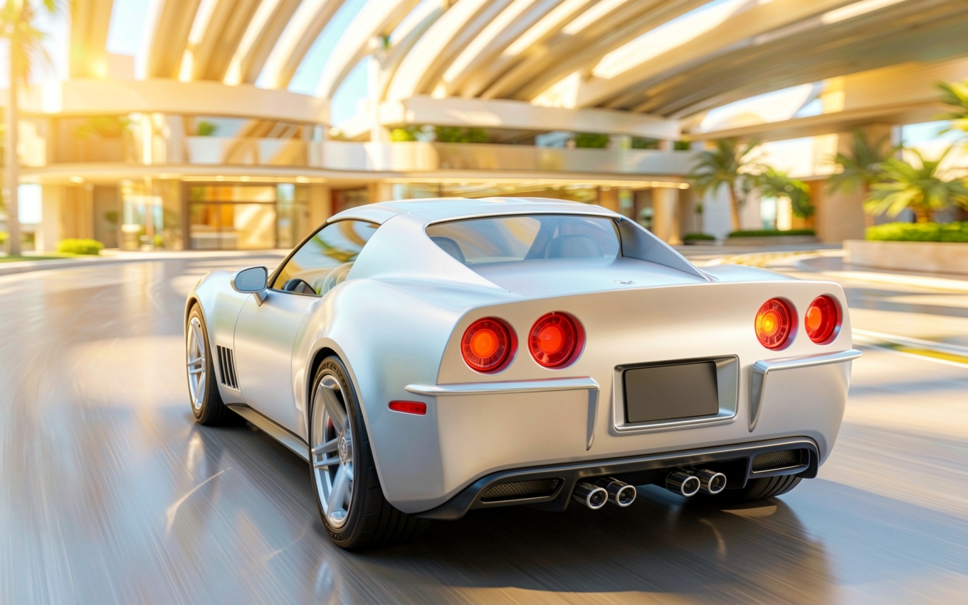 Серебристый спорткар Chevrolet Corvette в солнечном городе