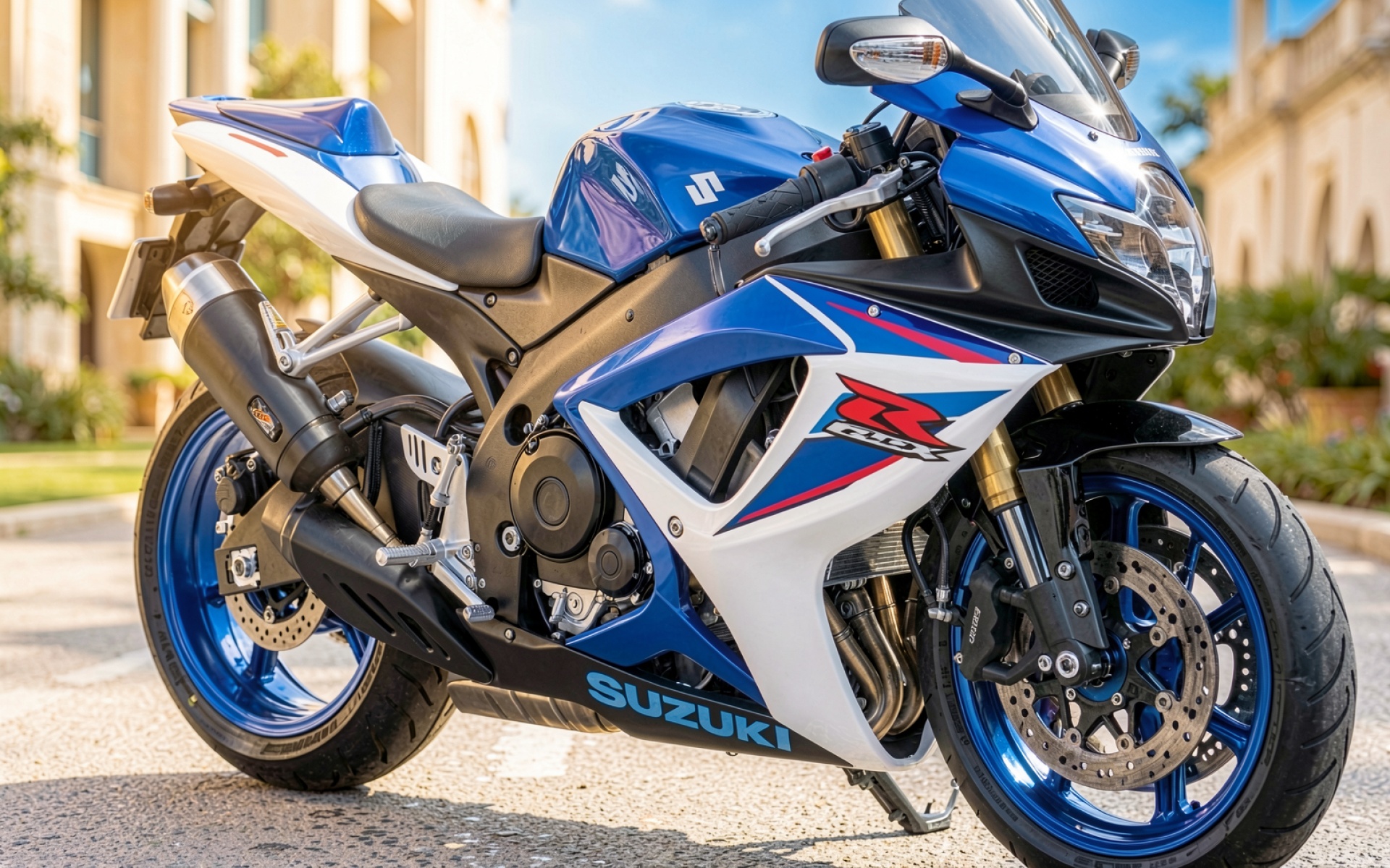 Спортивный мотоцикл Suzuki GSX-R синий белый городской фон