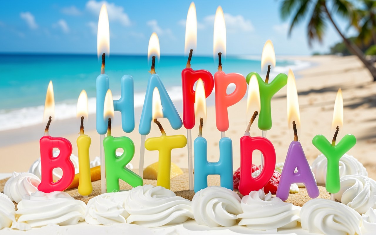 Разноцветные свечи с надписью Happy Birthday на пляже
