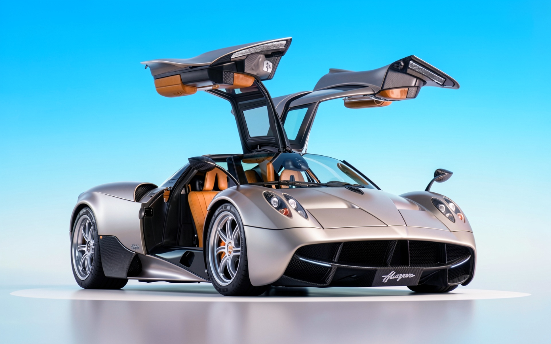 Гиперкар Pagani Huayra серебристый цвет открытые двери