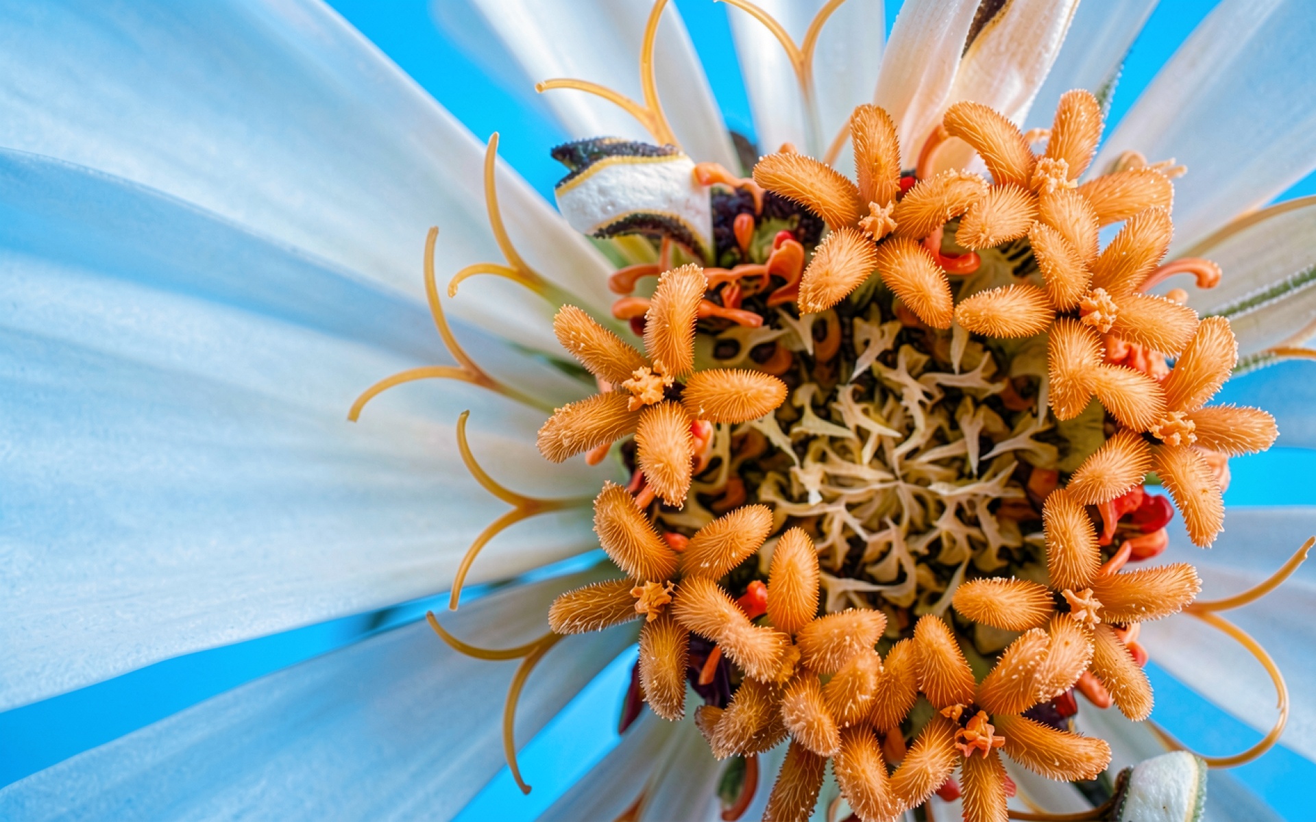 Изображение демонстрирует детальную текстуру лепестков с мягкими переходами белого цвета и контрастные ворсистые элементы центральной части. Освещение создает четкие блики на изгибах тычинок, а глубокие тени подчеркивают объем каждой детали сердцевины. Плавный градиент голубого фона обеспечивает визуальную чистоту композиции. Сайт предоставляет удобный предпросмотр перед загрузкой для оценки качества на экране.