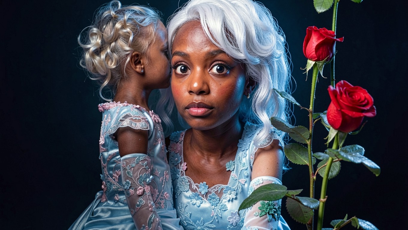 Техническое исполнение кадра фокусируется на контрасте между глубоким темным фоном и холодными оттенками атласа. Текстура ткани передает мягкие переливы света, создавая выразительные блики на складках голубых платьев. Освещение подчеркивает гладкость кожи и детализацию серебристых волос, при этом тени ложатся мягко, сохраняя объем лиц. Насыщенный красный цвет роз создает цветовой акцент, который уравновешивается градиентами фона. Сайт предлагает удобный предпросмотр перед загрузкой для оценки качества на экране.