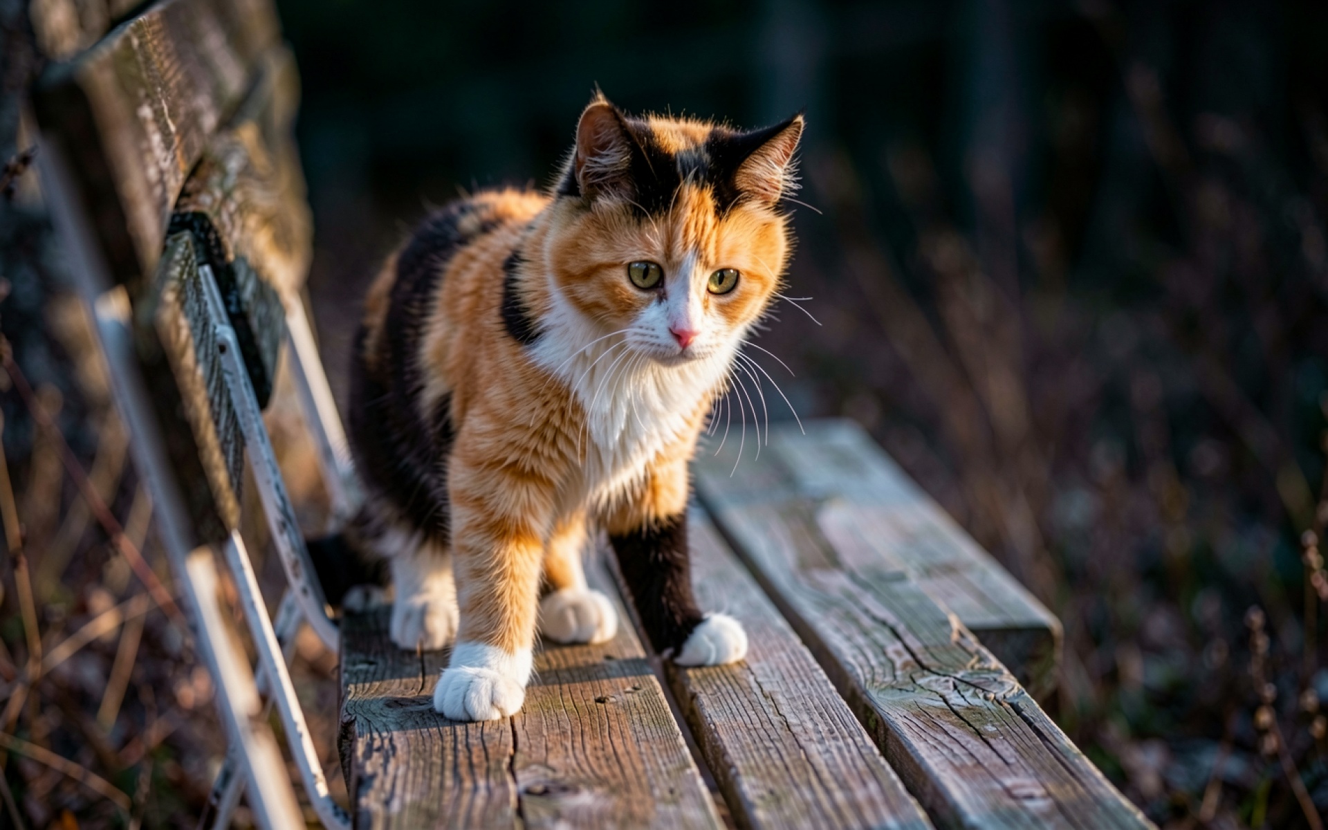 Трехцветная кошка на старой деревянной скамье обои