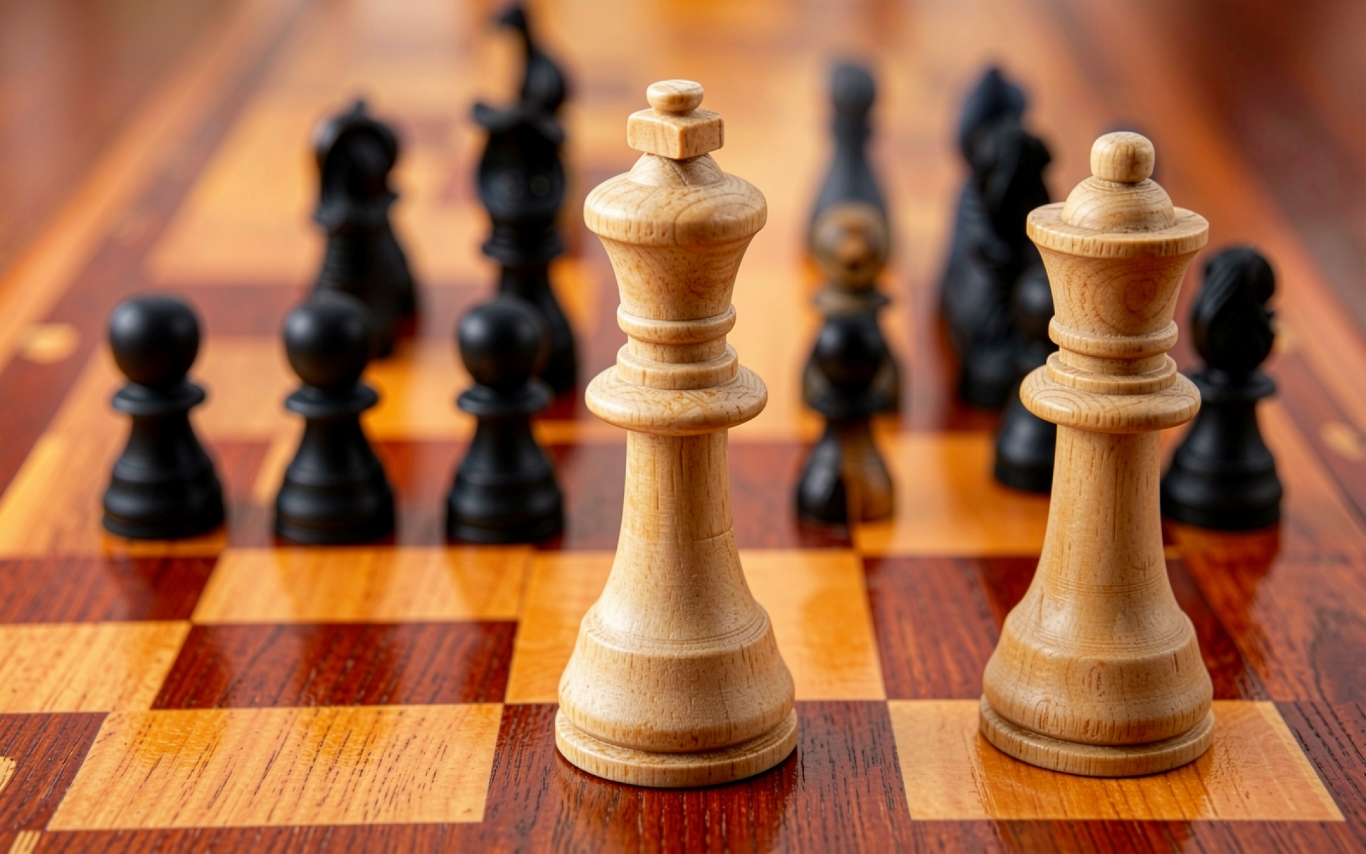 Изображение детально передает текстуру натурального дерева с выраженными волокнами и глянцевым покрытием. Освещение создает мягкие блики на поверхности фигур и глубокие тени в местах их соприкосновения с доской. Градиенты фона плавно уходят в размытие, акцентируя внимание на переднем плане. На сайте доступен удобный предпросмотр перед скачиванием для оценки качества на экране.