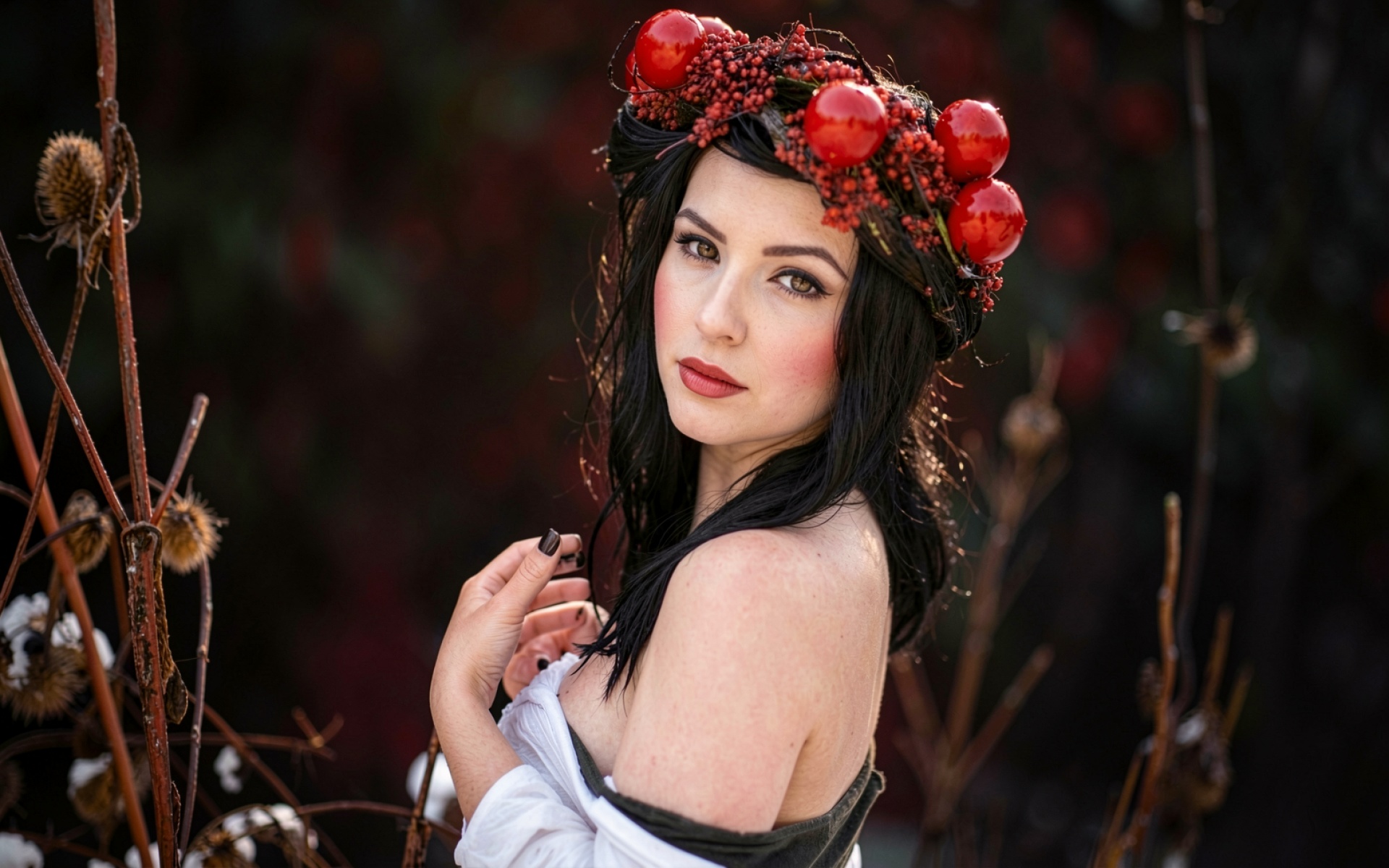 Заберите JPG-файл «Девушка с черными волосами в венке из красных ягод» на нашем сайте — и вот обоснование: другие сайты обрезают края, а у нас полный кадр.