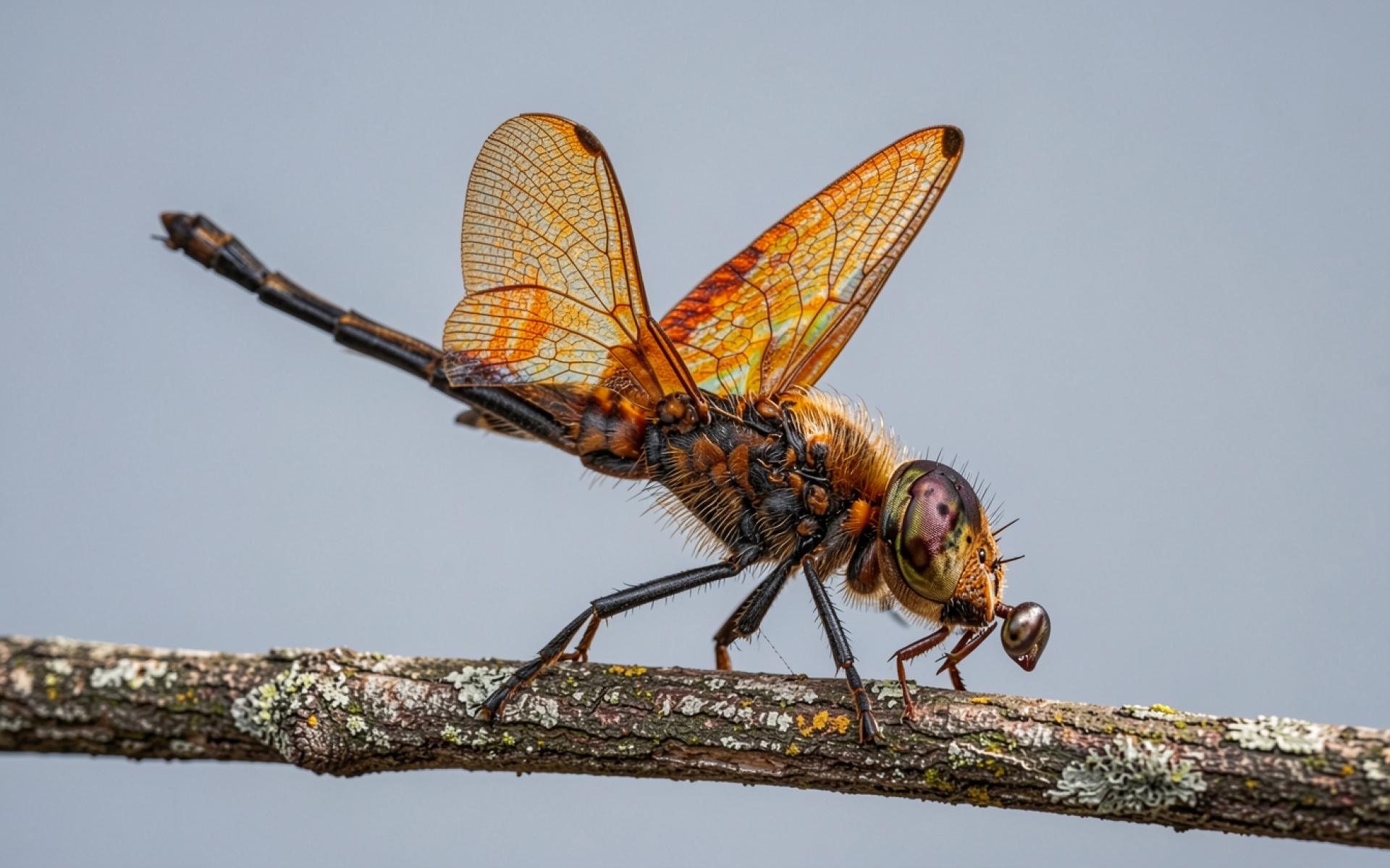 Изображение детально передает хитиновую структуру тела и тонкое жилкование прозрачных крыльев. Освещение подчеркивает контраст между насыщенным оранжевым пигментом насекомого и нейтральным градиентом заднего плана. Мягкие тени под брюшком и четкие блики на фасеточных глазах создают объем. На сайте доступен удобный предпросмотр перед скачиванием для оценки качества отображения на экране.
