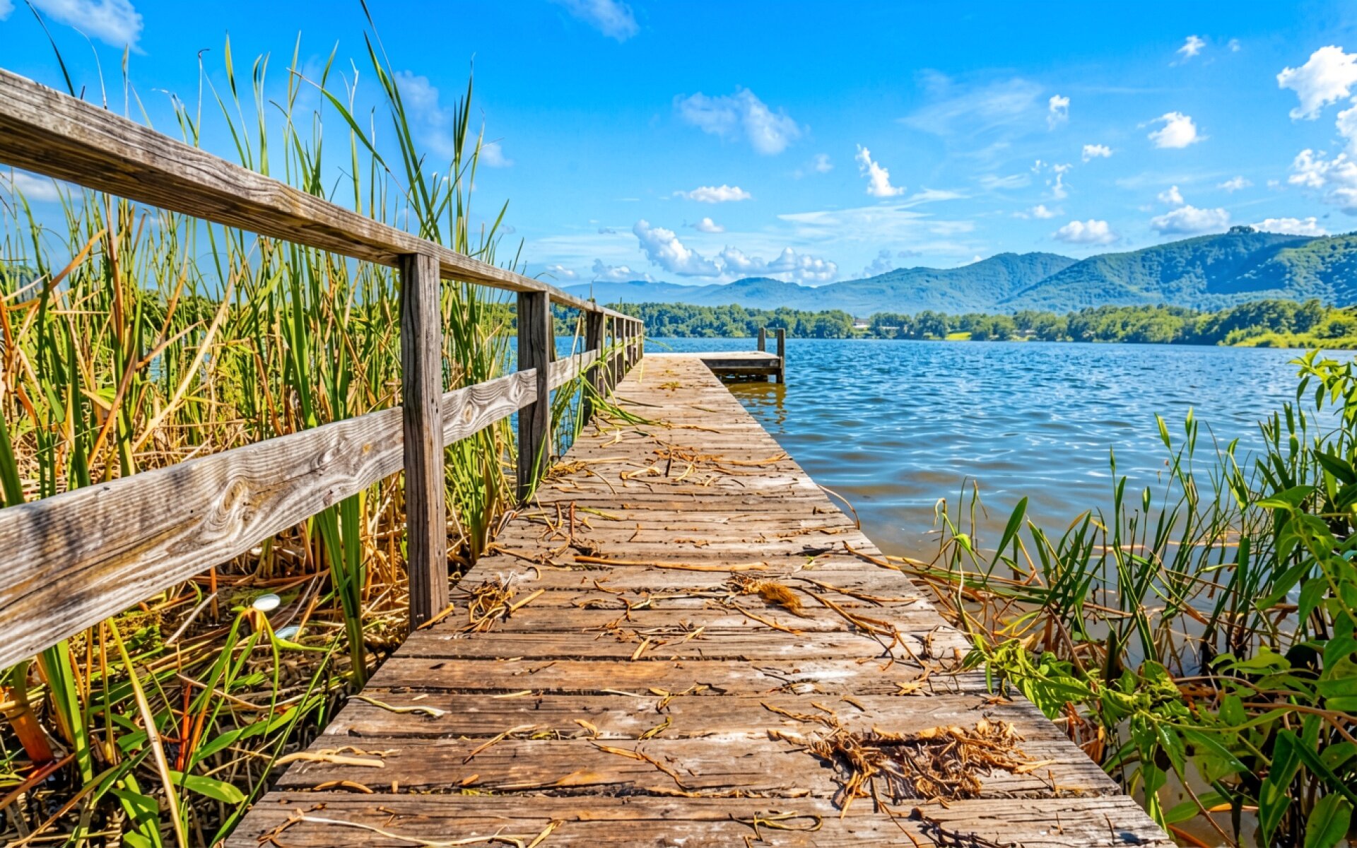 Изображение детально передает грубую текстуру старого дерева с выраженными волокнами и трещинами на досках. Естественное дневное освещение создает четкие контрасты между яркими бликами на поверхности воды и глубокими тенями под перилами. Плавные градиенты синего неба переходят в дымчатые оттенки далеких горных хребтов, что обеспечивает визуальную глубину сцены. Перед загрузкой доступен удобный предпросмотр для оценки качества отображения всех элементов на вашем экране.