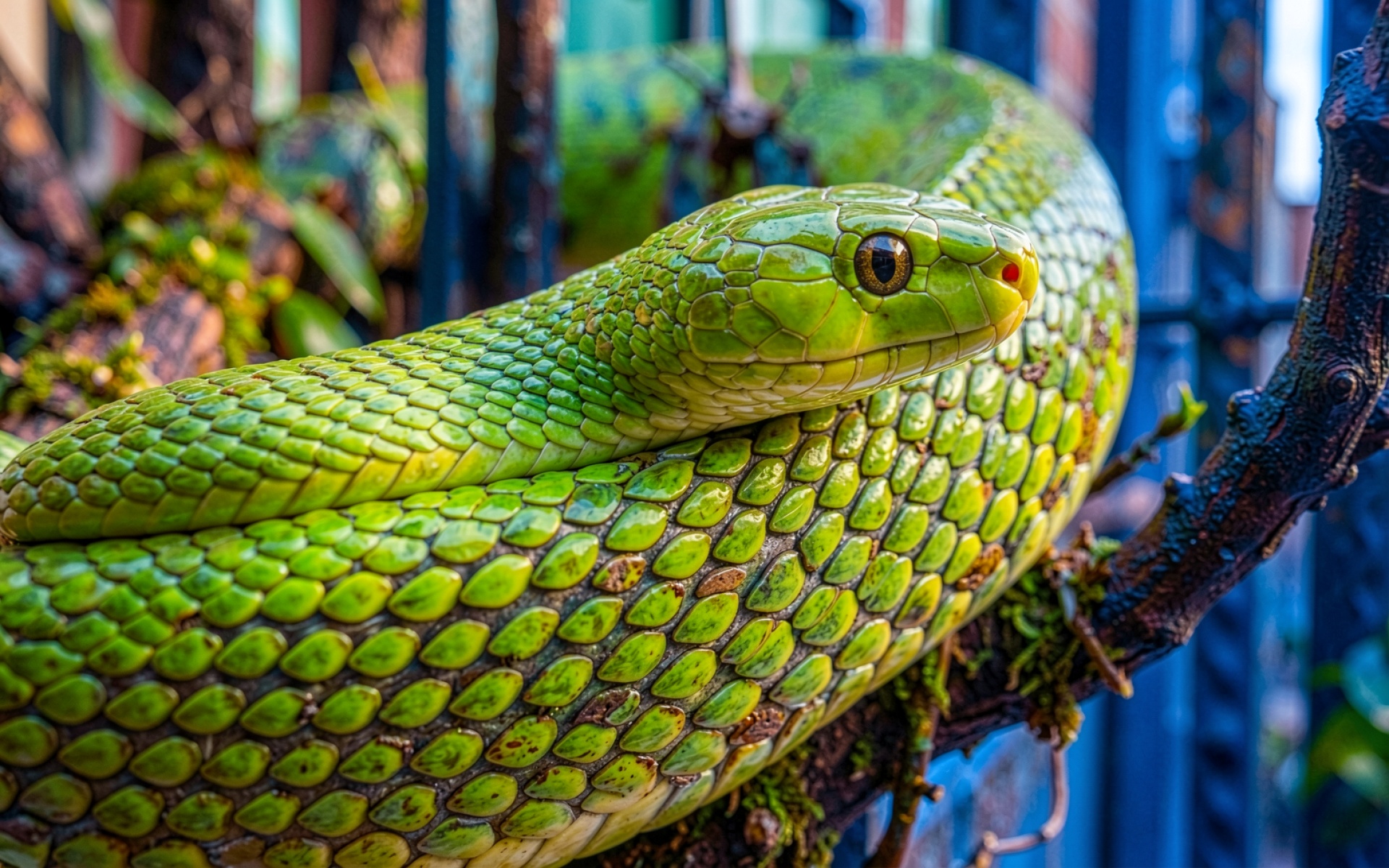Скачивание JPG «Зеленый древесный питон на темной ветке» с нашего сайта нужно, потому что эта версия JPG сохраняет все оттенки теней и света.