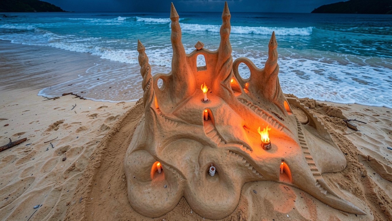 Изображение детально передает зернистую текстуру влажного песка и плавные переходы световых градиентов от теплых оранжевых оттенков пламени к холодным синим тонам океана. Контрастное освещение создает глубокие тени в нишах архитектурных форм, подчеркивая объем каждой башни и прорисовку мелких деталей фасада. На сайте доступен удобный предпросмотр перед скачиванием для оценки качества на экране.
