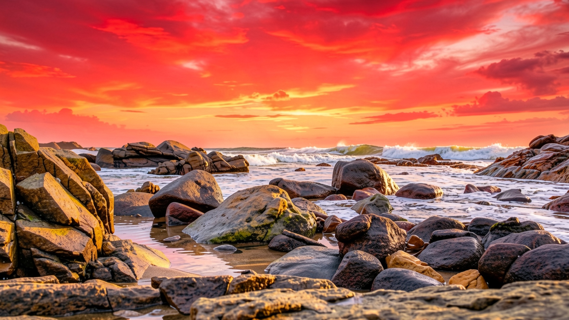 Изображение детально передает шероховатость гранитных валунов и глянцевый блеск мокрых поверхностей. Освещение характеризуется интенсивным контрастом между глубокими тенями в расщелинах камней и яркими бликами на гребнях волн. Градиент неба переходит от насыщенного алого к золотистому у линии горизонта, создавая объемную атмосферу. На сайте доступен удобный предпросмотр перед скачиванием для оценки качества на экране.