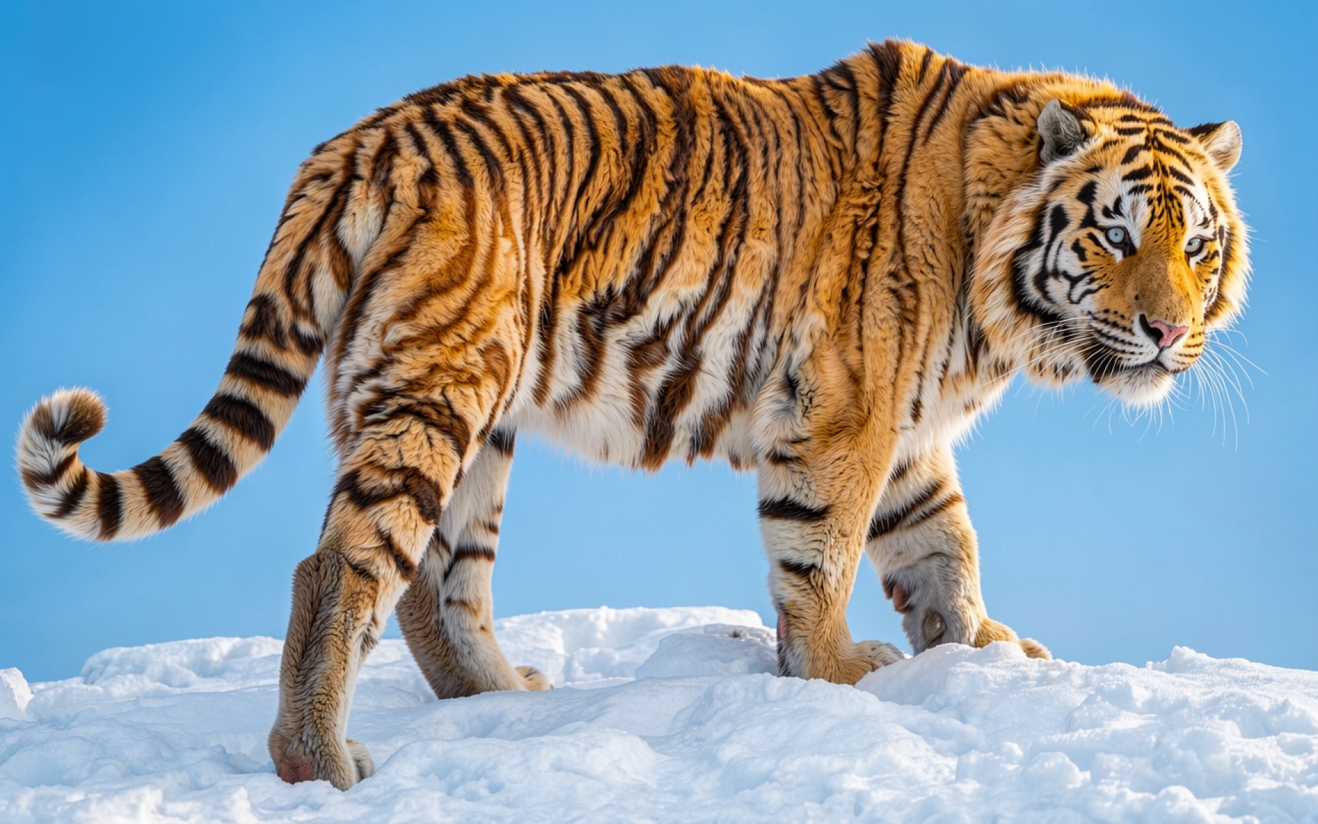 Изображение детально передает текстуру густого меха хищника, где каждый волосок четко отделен от соседнего. Освещение имитирует яркий зимний день, создавая резкие блики на белом снегу и глубокие тени в складках мышц животного. Плавные переходы голубого неба создают чистый фон, который подчеркивает контраст оранжевых полос тигра. На сайте доступен удобный предпросмотр перед загрузкой для оценки качества на экране.