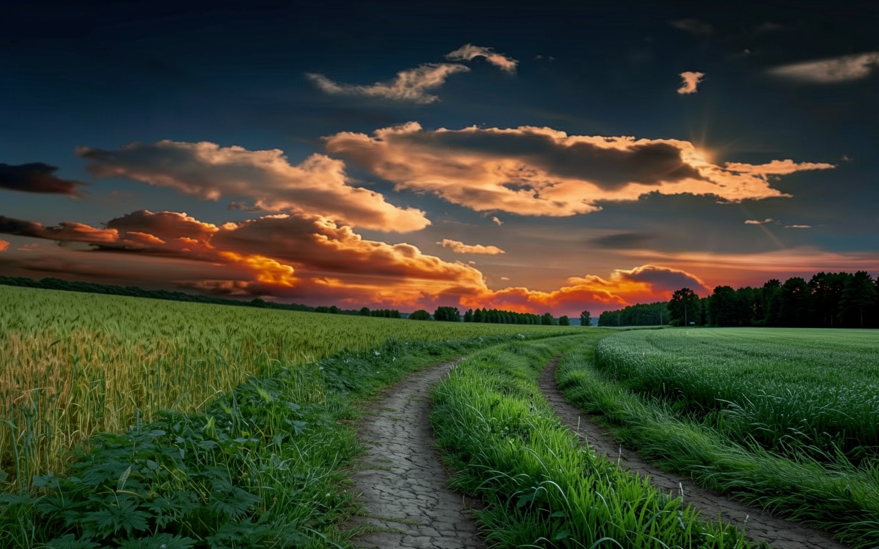 На нашем сайте вы можете скачать JPG файл обоев 'Сельская дорога через зеленое поле на закате', и вот почему это важно: эта JPG версия сохраняет все оттенки теней и света.