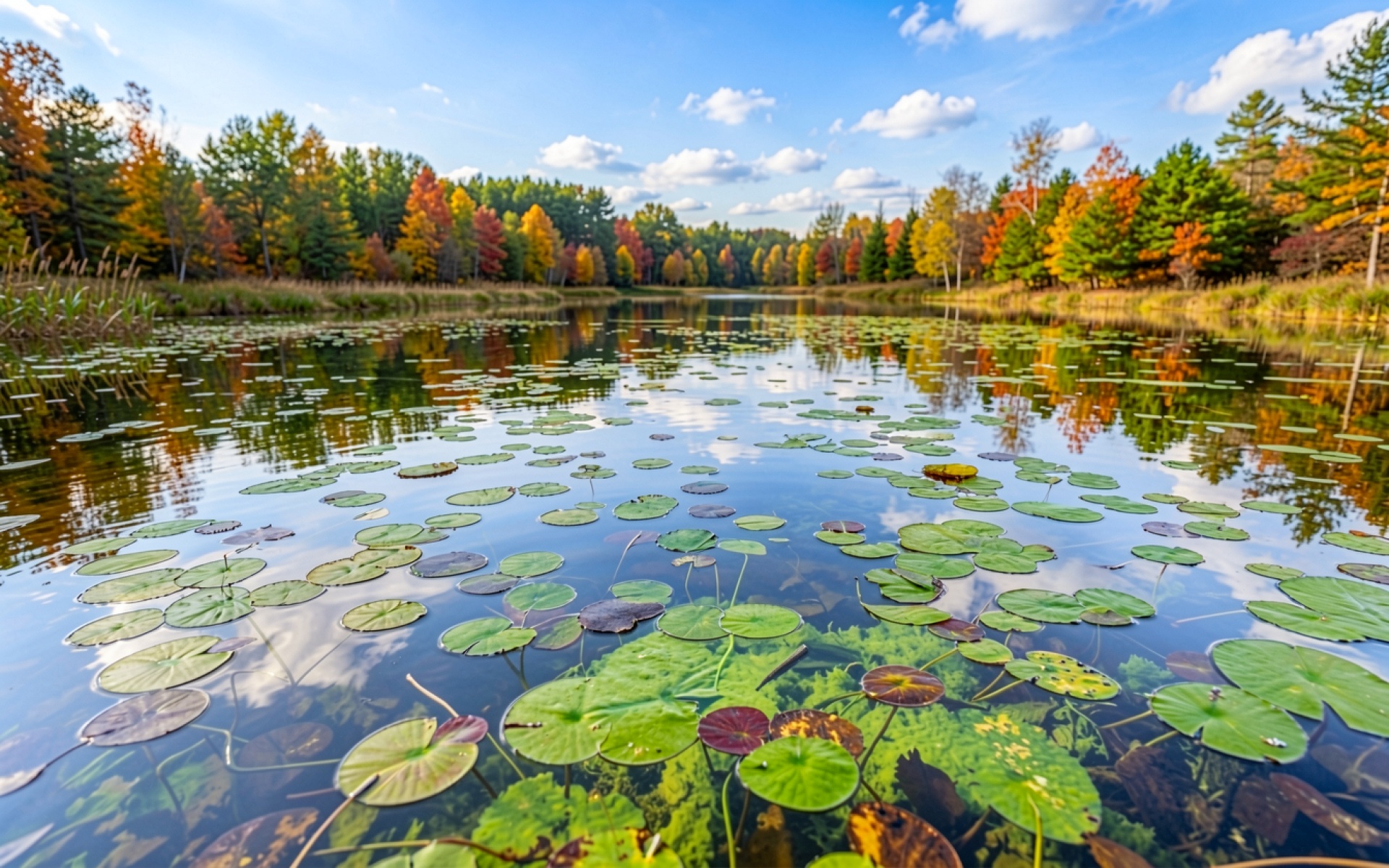 Наш сайт предлагает скачать обои Осенний пруд с кувшинками в ярком лесу в JPG, и причина проста: другие сайты обрезают края, но у нас полный кадр.