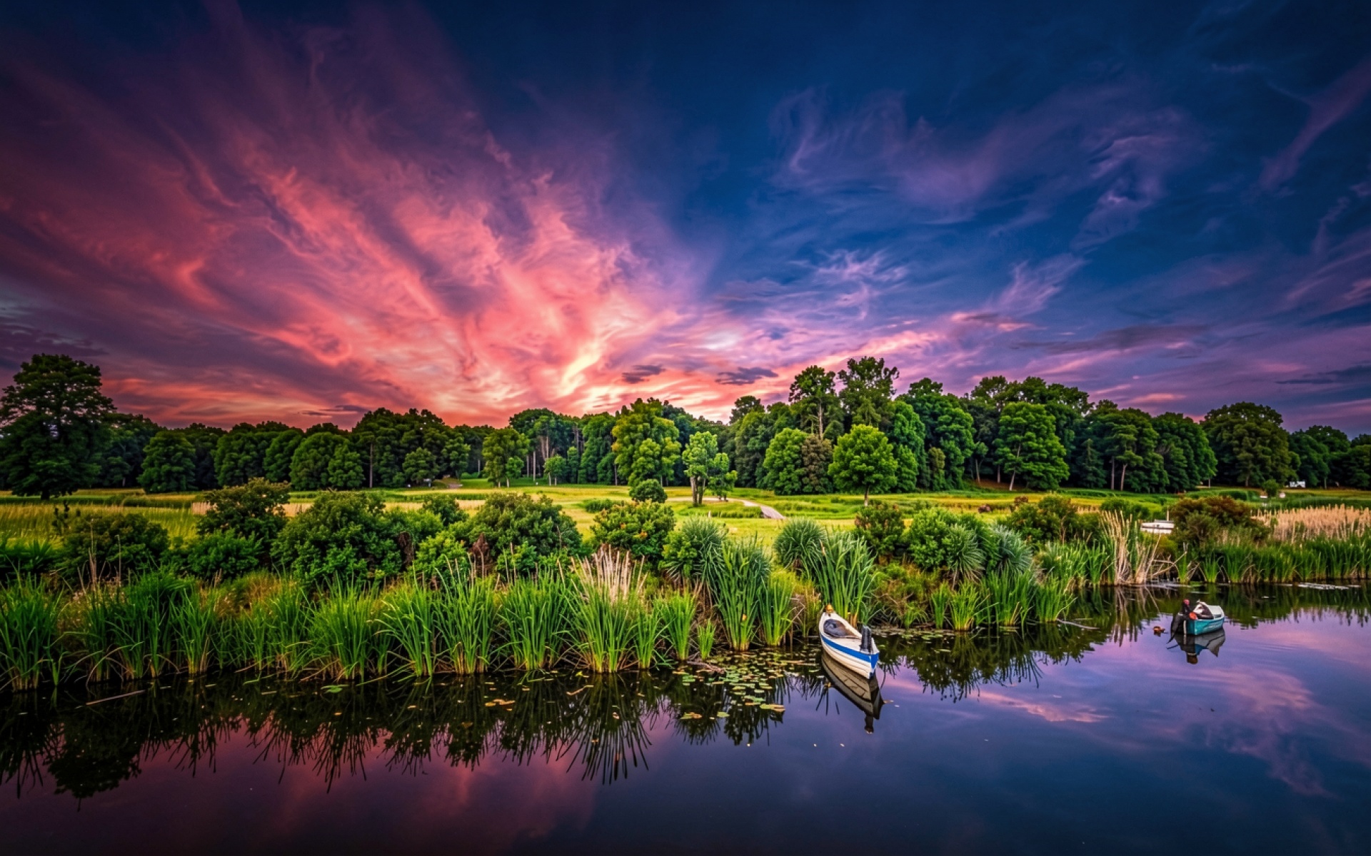 Изображение фокусируется на контрасте между светлым корпусом лодки и глубокими синими тонами воды. Текстура водной глади передает четкие зеркальные отражения неба, а градиенты заката переходят от насыщенного пурпурного к темно-синему в верхней части кадра. Освещение подчеркивает контуры прибрежного камыша и лиственной зелени деревьев на заднем плане. На сайте доступен удобный предпросмотр перед скачиванием, чтобы оценить качество отображения всех цветовых переходов на вашем экране.
