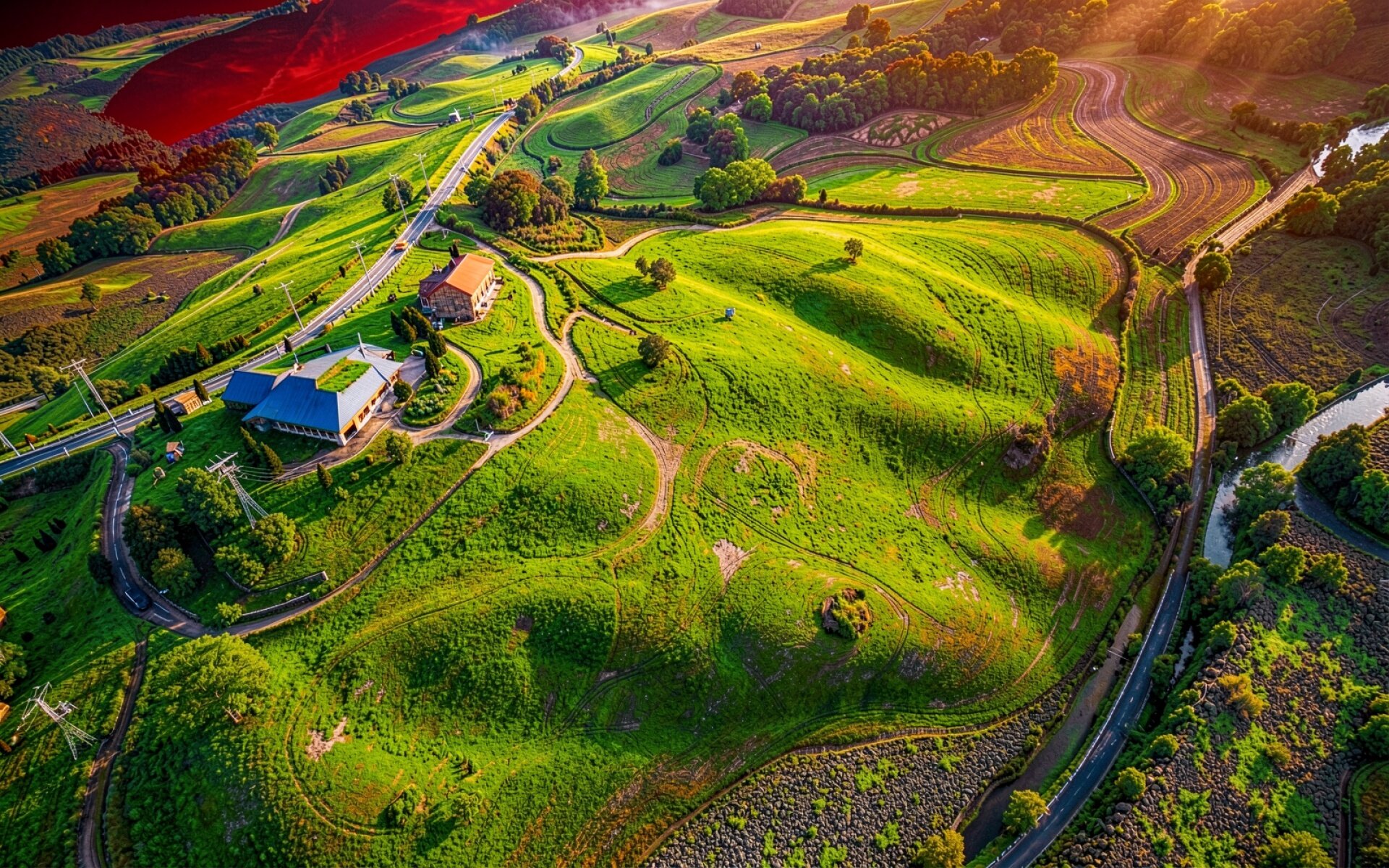 Скачайте это изображение высокого разрешения для обновления рабочего стола, чтобы добавить в интерьер цифрового пространства ощущение простора и спокойствия. Снимок представляет собой вид с высоты птичьего полета на ярко-зеленые холмы с органическими линиями рельефа, дополненные сельскими постройками и извилистыми дорогами.