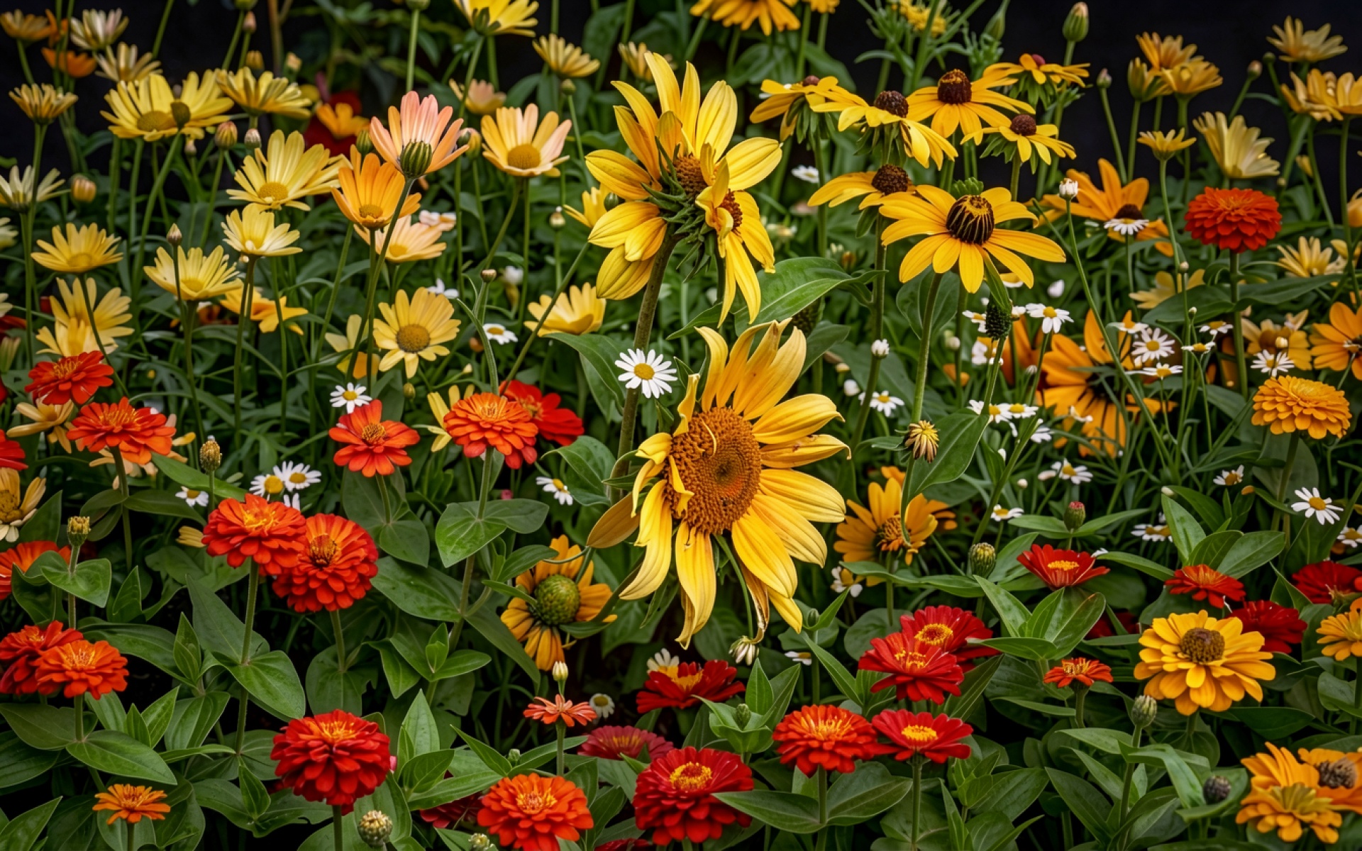 Скачайте JPG файл обоев Поле желтых и красных цветов летний сад на нашем сайте – и вот почему: эта JPG версия сохраняет все оттенки теней и света.